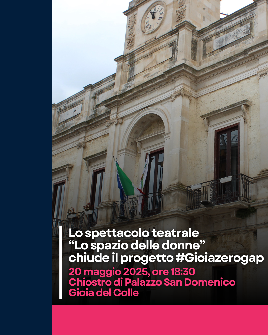 Domani, martedì 20 maggio 2025, nel chiostro di Palazzo San Domenico si terrà l’evento conclusivo del progetto #Gioiazerogap, finanziato da ANCI Puglia e Regione Puglia in sinergia con il Comitato Unico di Garanzia del Comune di Gioia del Colle nell'ambito del bando "Genere in Comune", misura regionale finalizzata alla sensibilizzazione, all'attuazione e alla valorizzazione della parità di genere all’interno delle amministrazioni locali.
