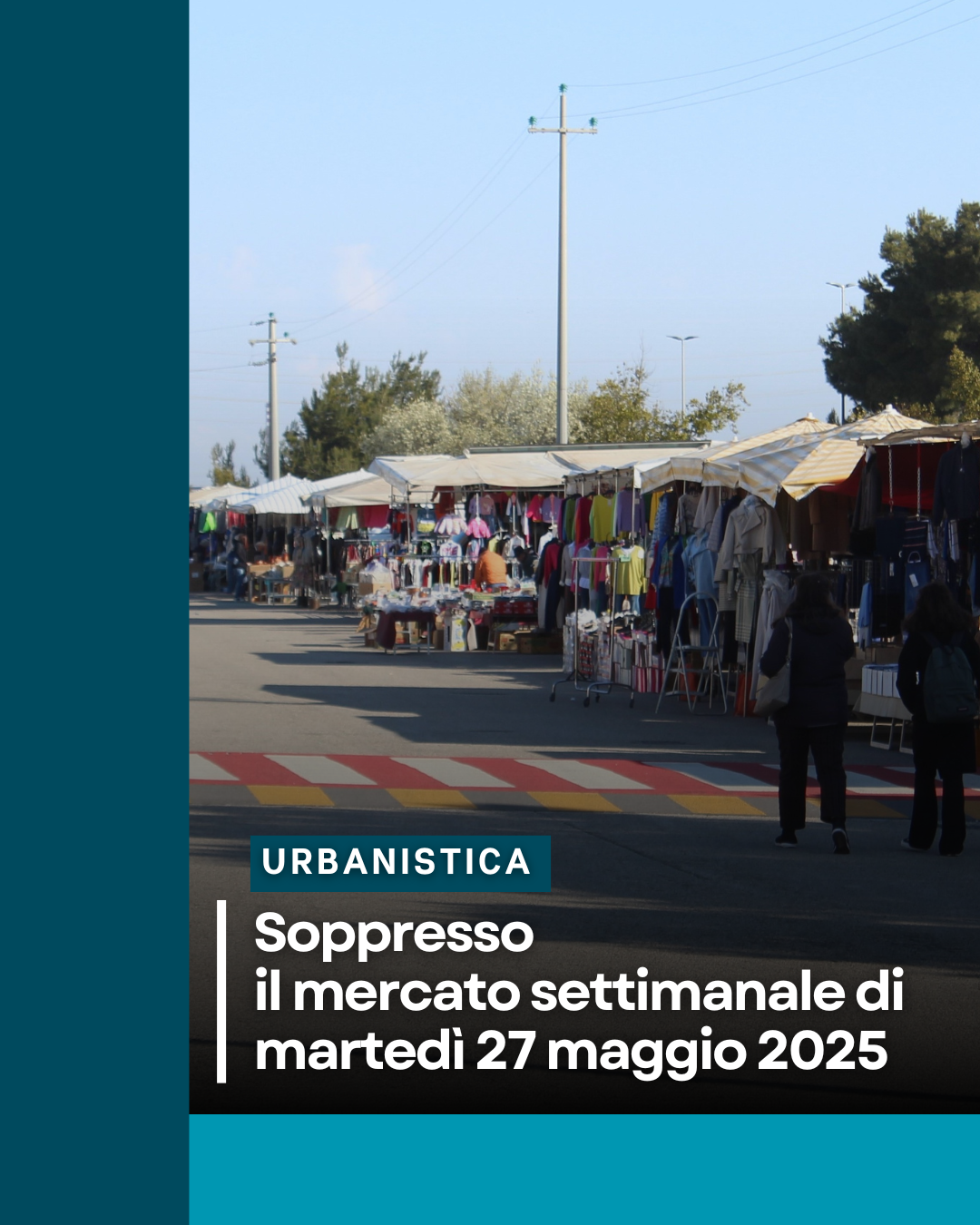 Si informa la cittadinanza che, con determinazione n. 573/2025 del Responsabile dell'Area Urbanistica, è stata disposta la soppressione del mercato settimanale in programma martedì 27 maggio 2025, in quanto l'area antistante al palazzetto dello sport "P. Capurso" sarà occupata dagli operatori dello spettacolo viaggiante per i festeggiamenti in onore del patrono San Filippo Neri.