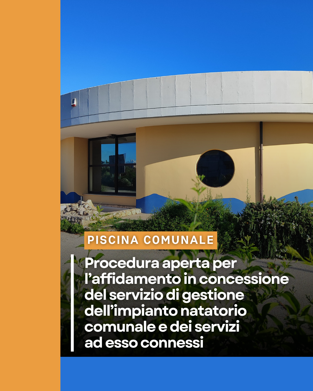 Con determinazione n. 526/2025 del Responsabile dell’Area Affari Generali, è stata avviata una nuova gara, mediante procedura aperta, per l’affidamento in concessione del servizio di gestione dell’impianto natatorio comunale e dei servizi ad esso connessi (per la durata di 10 anni).