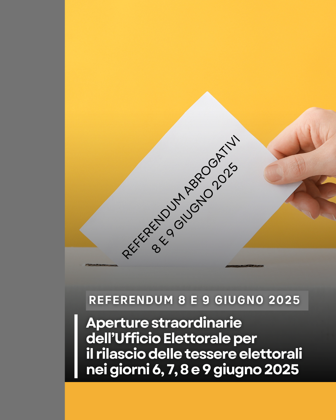 Si informa la cittadinanza che, in occasione della consultazione referendaria in programma domenica 8 e lunedì 9 giugno 2025, l’Ufficio Elettorale sarà aperto al pubblico per il rilascio delle tessere elettorali: