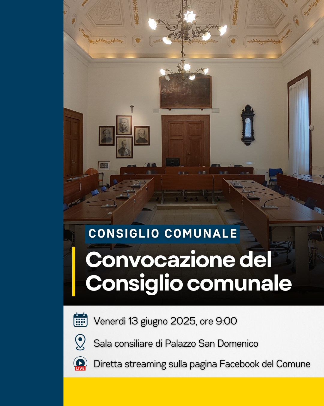 il Consiglio comunale di Gioia del Colle in seduta ordinaria e in 1^ convocazione per il giorno 13 giugno 2025, alle ore 9:00 e, nel caso non si raggiunga il numero legale, in 2^ convocazione per il giorno 14 giugno 2025, alle ore 10:00, nella sala consiliare di Palazzo San Domenico, per la trattazione dei seguenti punti all'ordine del giorno: