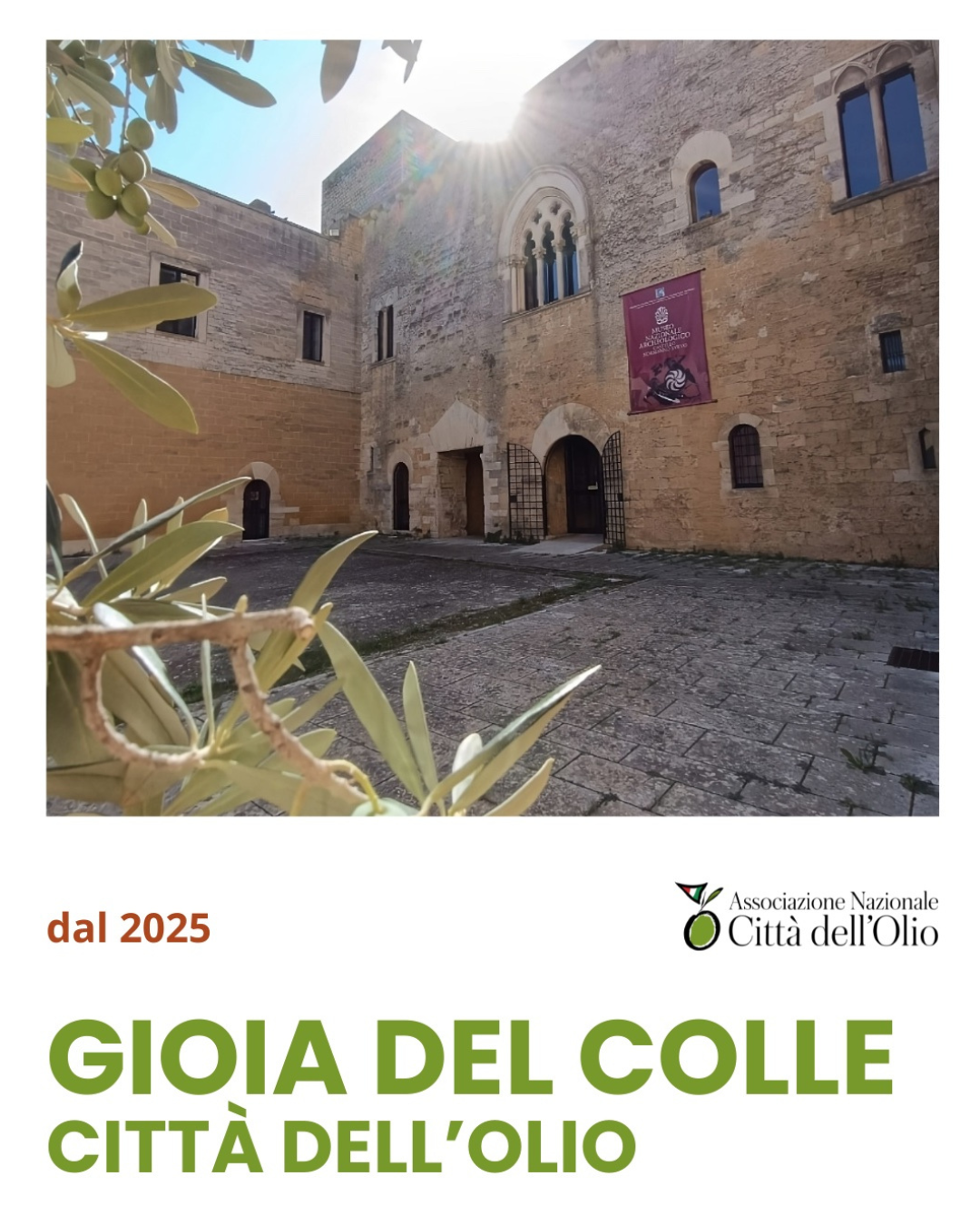Lunedì 16 giugno 2025, alle ore 18:30, nella sala consiliare di Palazzo San Domenico, il comune di Gioia del Colle riceverà la bandiera “Città dell’Olio”.