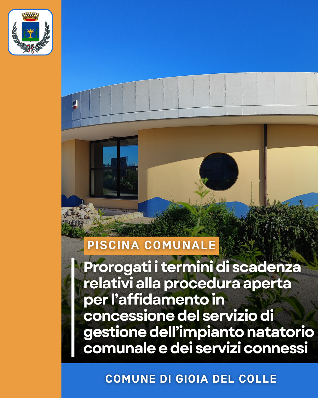 Si rende noto che sono stati prorogati i termini di scadenza relativi alla procedura aperta per l’affidamento in concessione del servizio di gestione dell’impianto natatorio comunale e dei servizi connessi (per la durata di 10 anni).