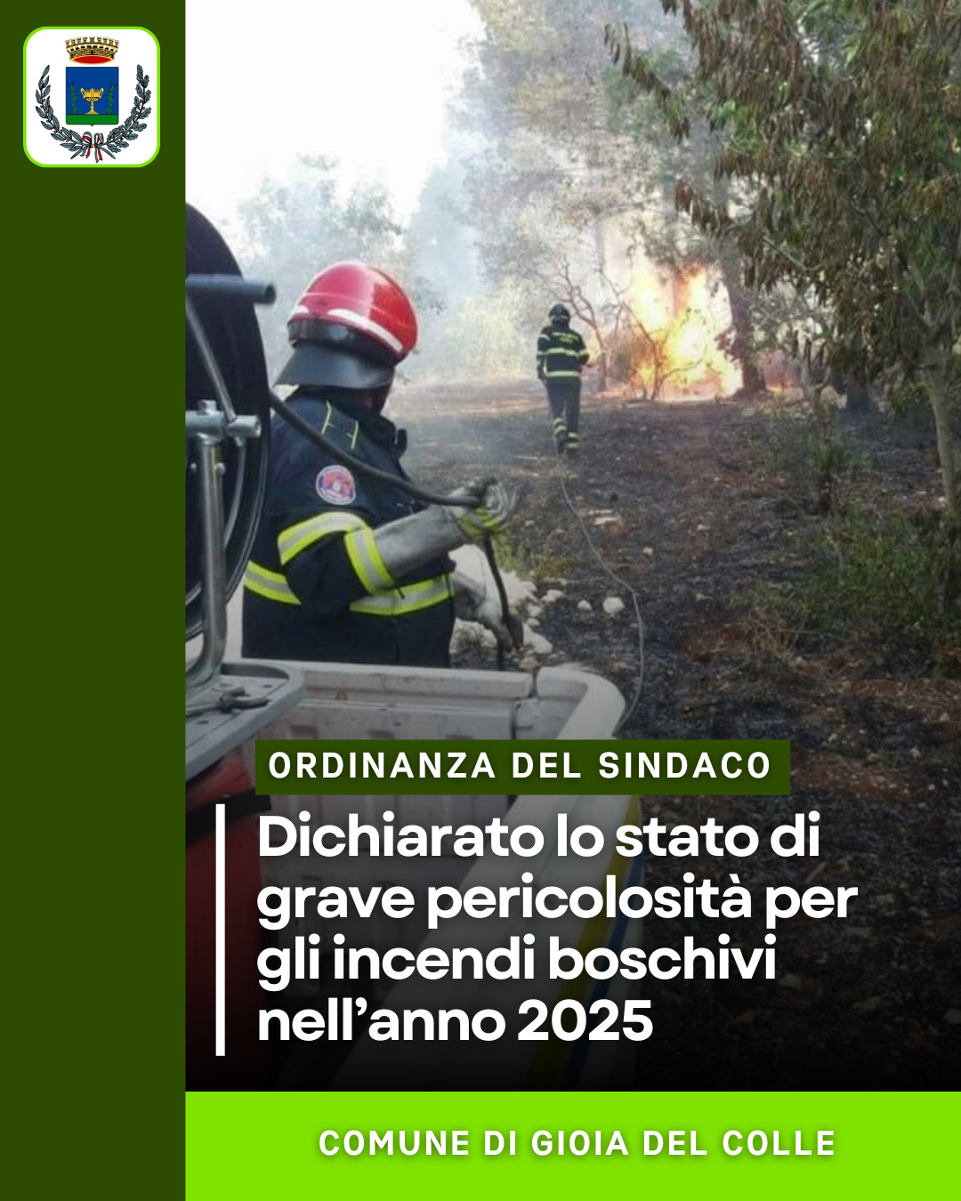 Con ordinanza del Sindaco n. 96/2025, per il periodo che intercorre tra il 15 giugno e il 15 settembre 2025, è stato dichiarato lo stato di grave pericolosità per gli incendi, in riferimento alle aree boscate, cespugliate, arborate, coltivate, incolte e a pascolo del territorio comunale.