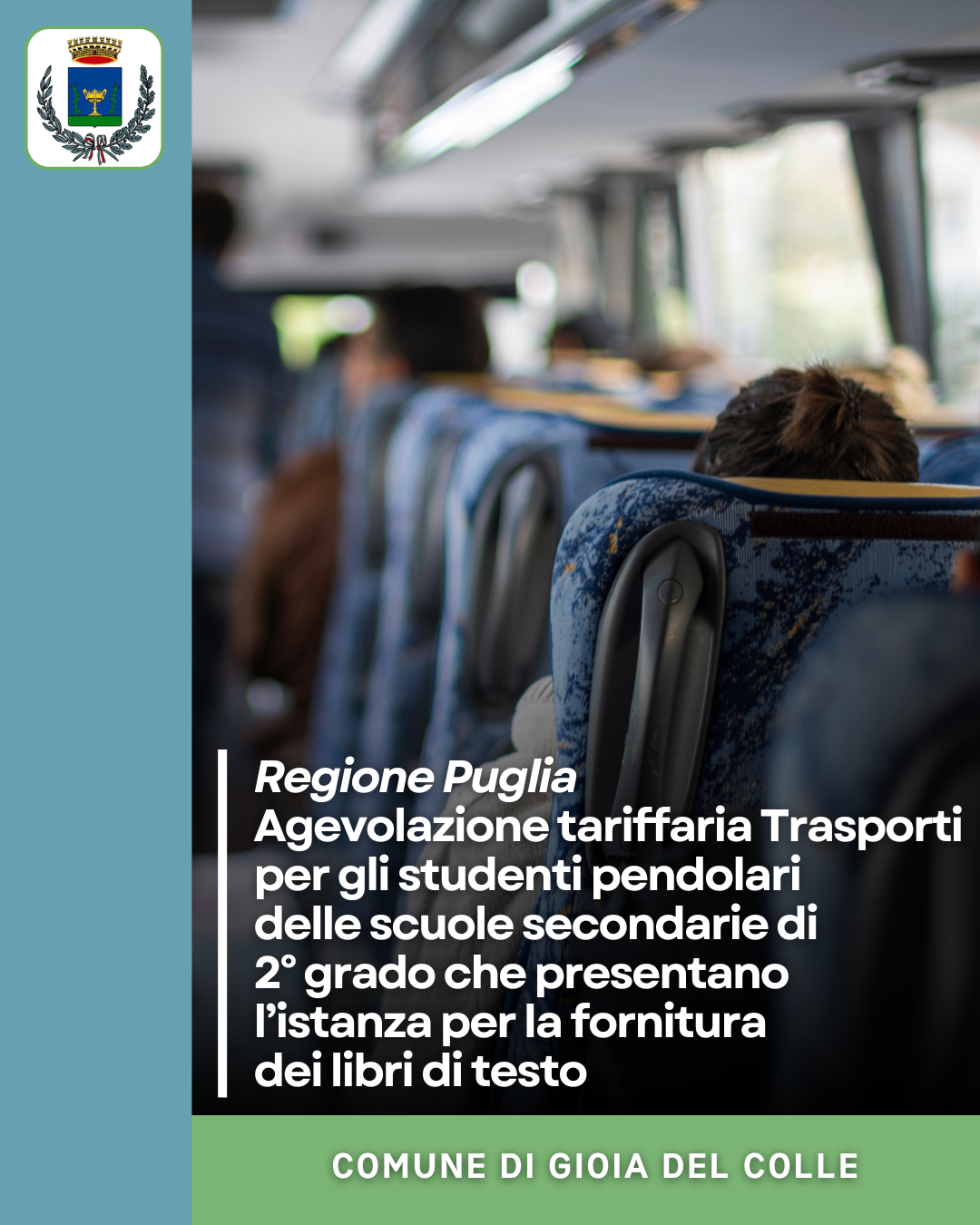 Nello specifico, gli studenti pendolari delle scuole secondarie di 2° grado, che presentano l’istanza per la fornitura dei libri di testo nella prima finestra temporale, possono richiedere anche l’accesso all'agevolazione tariffaria sull'acquisto dell'abbonamento mensile per l'utilizzo dei servizi di trasporto pubblico di competenza della Regione Puglia e della Città Metropolitana e Province pugliesi.
