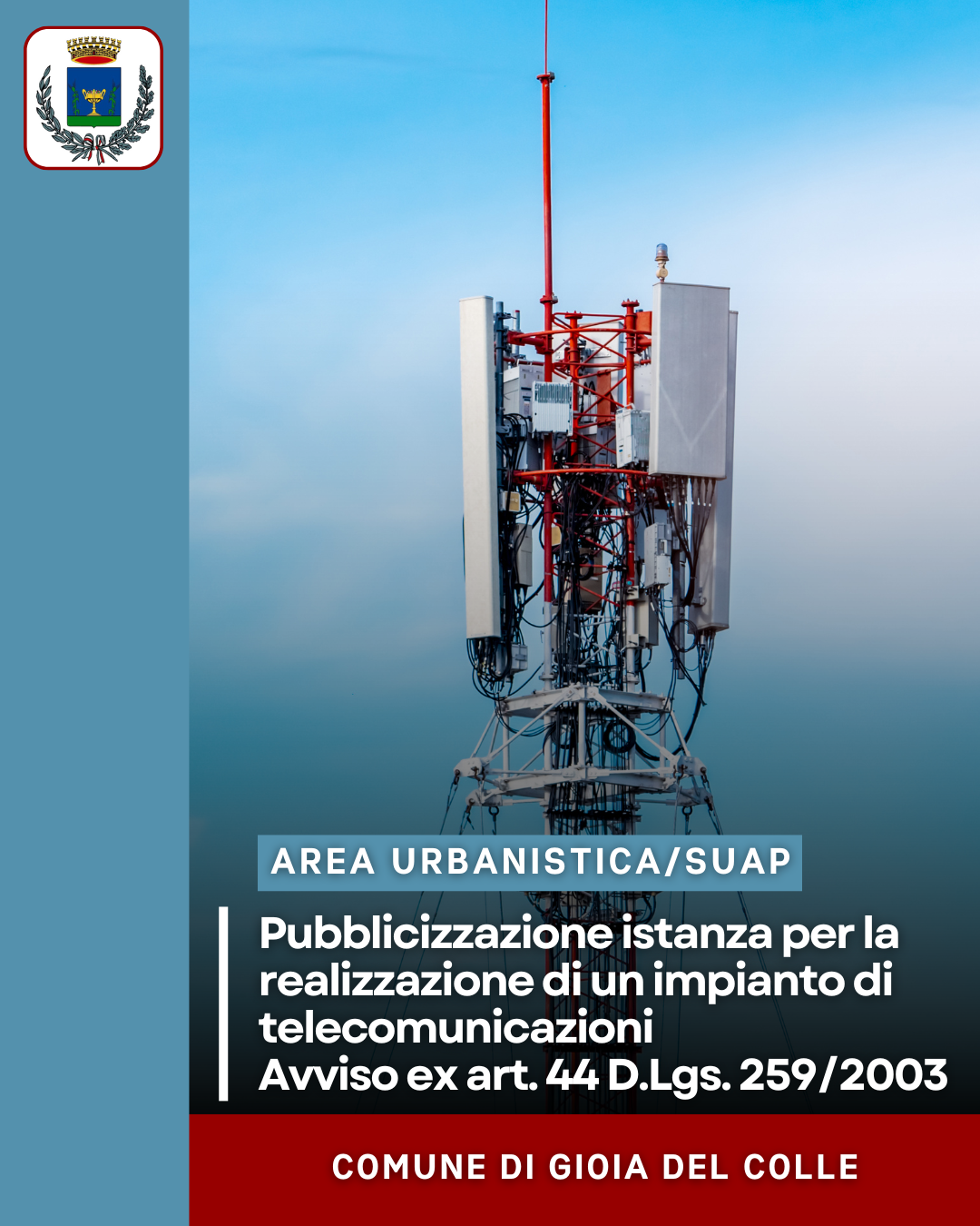 Ai sensi dell’art. 44, co. 5, del D.Lgs. 259/2003, il Direttore dell'Area Urbanistica-Suap dà notizia che in data 07/07/2025 è pervenuta, tramite il portale “Impresainungiorno”, un’istanza unica ex art. 44 del D.Lgs. 259/2003, da parte della società INWIT S.p.A., con sede legale in Milano, per la realizzazione di un impianto di telecomunicazioni multigestore nel Comune di Gioia del Colle, in zona Strada Provinciale n. 51, su area individuata in catasto al Fg. 136, p.lla 91.