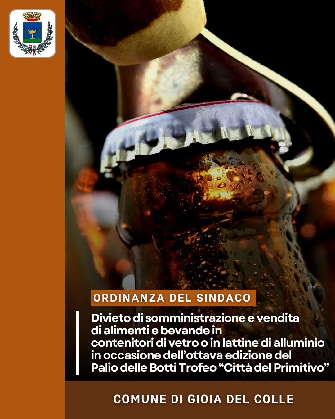 Con ordinanza n. 126/2025 il sindaco Giovanni Mastrangelo ha disposto il divieto, su tutto il territorio comunale, di somministrazione e vendita di alimenti e bevande in contenitori di vetro o in lattine di alluminio nel corso dell'ottava edizione del Palio delle Botti Trofeo "Città del Primitivo", e nello specifico:
