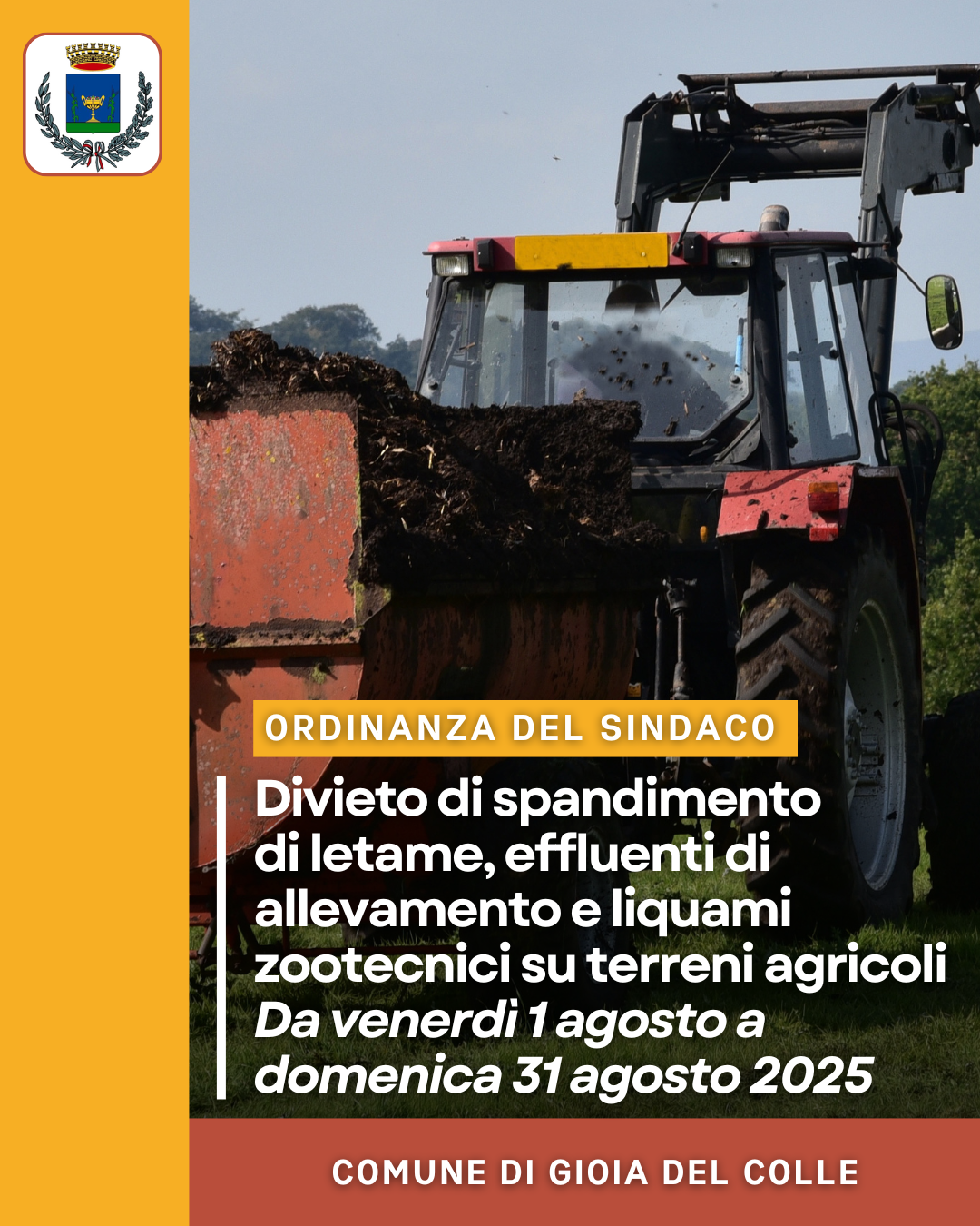 Con ordinanza n. 135/2025 il Sindaco ha disposto, per il periodo che va da venerdì 1 agosto a domenica 31 agosto 2025, il divieto di spandimento di letame, effluenti di allevamento e liquami zootecnici su terreni agricoli.