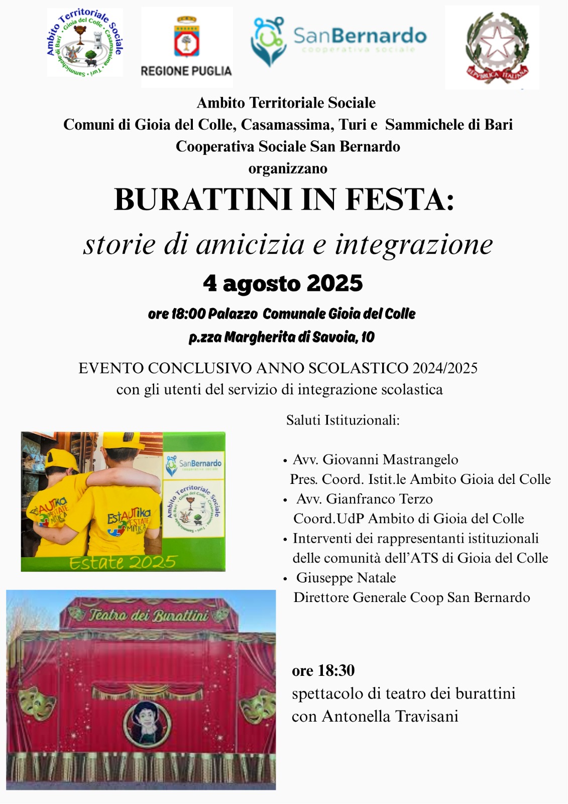 L’evento, promosso dall’Ambito Territoriale Sociale di Gioia del Colle (costituito dai comuni di Gioia del Colle, Casamassima, Sammichele di Bari e Turi), coinvolgerà alunne e alunni, studentesse e studenti, famiglie e operatori del servizio di integrazione scolastica erogato presso le scuole dell’Infanzia, primarie e secondarie di primo grado dei Comuni di Ambito.