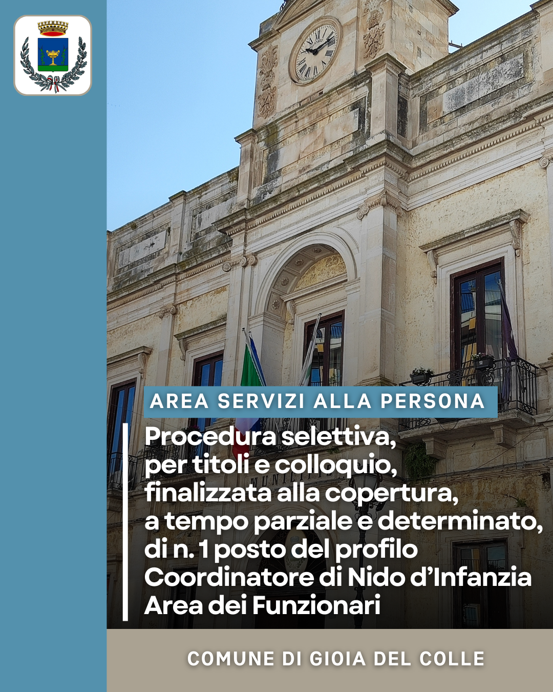 Con determinazione dell’Area Servizi alla Persona n. 1001/2025 è stato approvato l’avviso pubblico relativo alla procedura selettiva, per titoli e colloquio, finalizzata alla copertura, a tempo parziale e determinato, di n. 1 posto del profilo Coordinatore Nido d'Infanzia – Area dei Funzionari.
