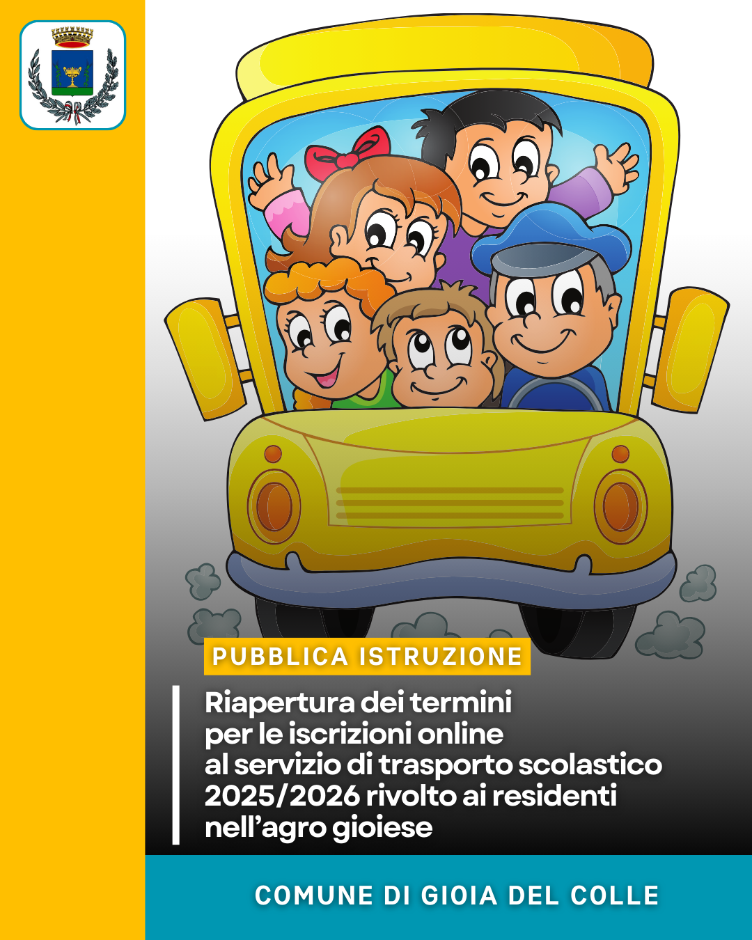 Si informa la cittadinanza che sono stati riaperti i termini per le iscrizioni al servizio di trasporto scolastico per l’a.s. 2025/2026 rivolto ai residenti nell’agro gioiese.