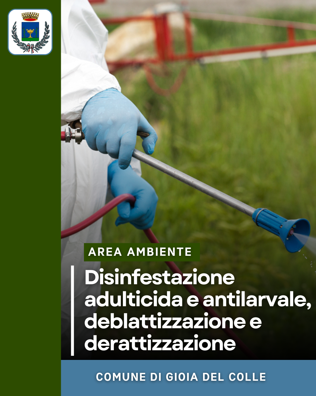 Domani, martedì 9 settembre 2025, sull'intero territorio comunale saranno eseguiti gli interventi di deblattizzazione e derattizzazione e, a partire dalle ore 23:30, di disinfestazione adulticida e antilarvale.