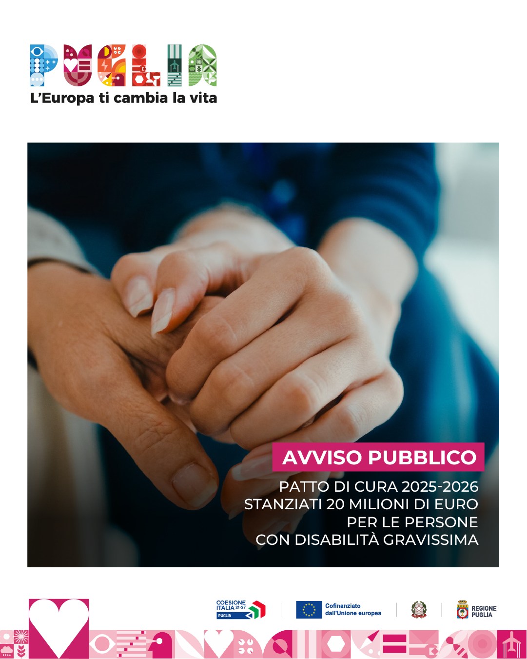 È possibile, pertanto, presentare la domanda di accesso alla misura “Patto di cura 2025-2026" fino alle ore 12:00 di martedì 23 settembre 2025 sulla piattaforma dedicata: https://pugliasociale-spid.regione.puglia.it