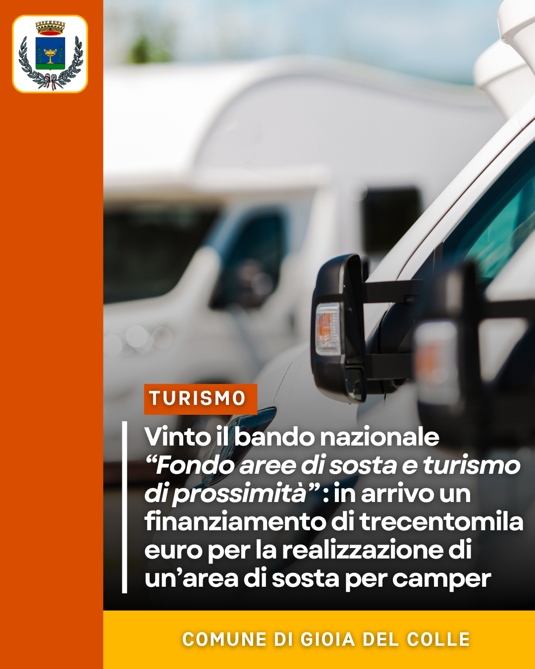 Il Comune di Gioia del Colle si è appena aggiudicato un finanziamento di trecentomila euro nell’ambito di un bando indetto dal Ministero del Turismo per la promozione del turismo all’aria aperta.