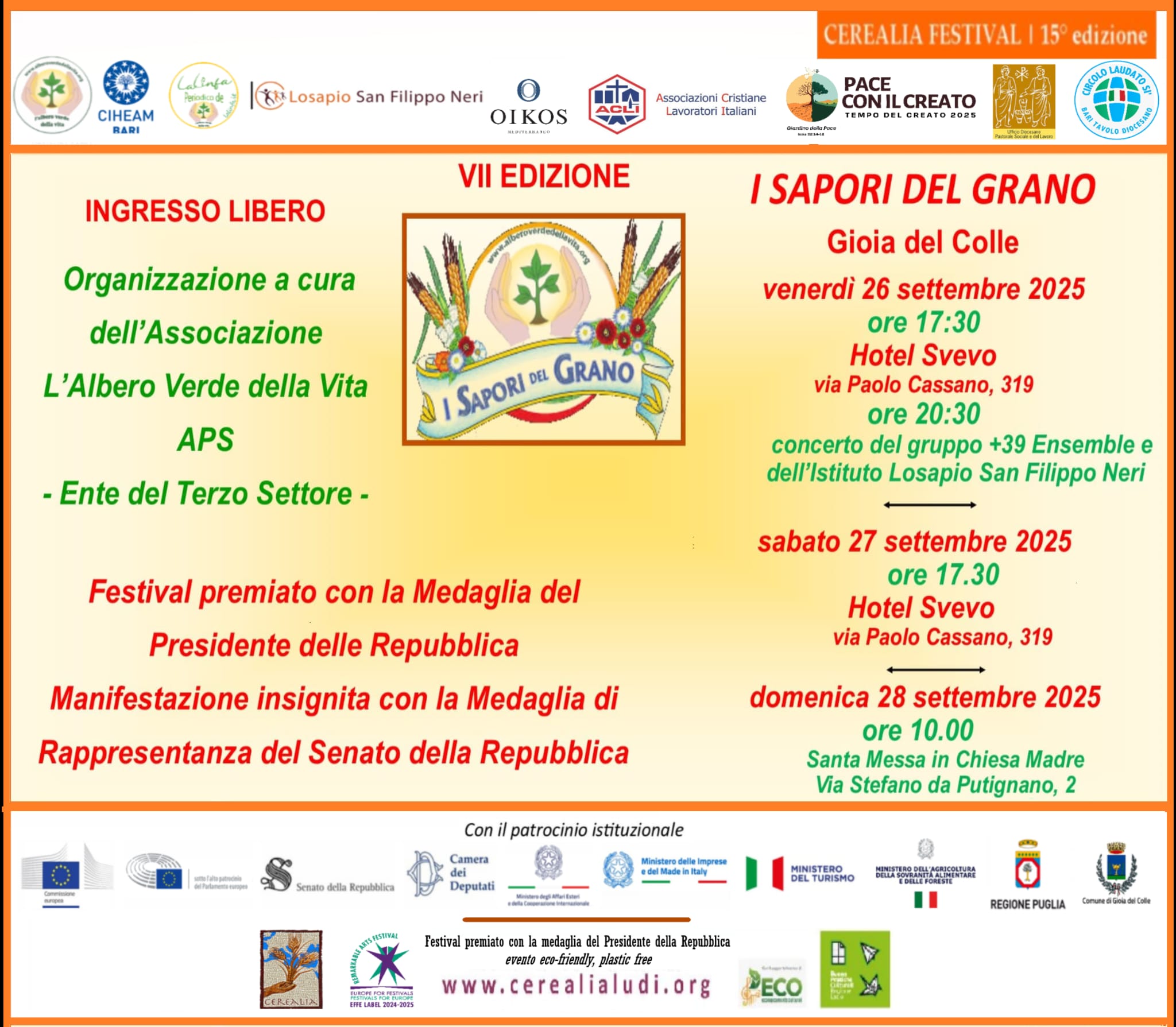 Al via la manifestazione "I sapori del grano" che, dal 26 al 28 settembre 2025, a Gioia del Colle sarà occasione di dibattito, confronto e riflessione su temi importanti come l'alimentazione consapevole, la sostenibilità, l'integrazione e la cooperazione sociale.