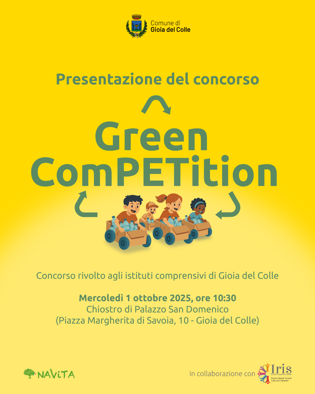 Mercoledì 1 ottobre 2025, alle ore 10:30, nel Chiostro di Palazzo San Domenico si svolgerà l’evento di presentazione del concorso ecologico “Green comPETition” che, promosso dal Comune di Gioia del Colle in collaborazione con la Navita srl e la società cooperativa sociale Iris, coinvolgerà alunne e alunni degli istituti comprensivi “Carano-Mazzini”, “Losapio-San Filippo Neri” e “Via Eva Gioia-Sammichele”.