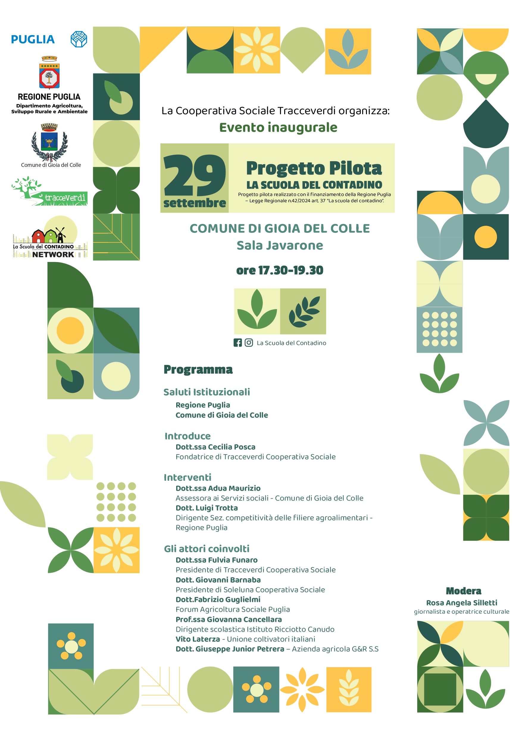 Oggi, alle ore 17:30, nella Sala Javarone di Palazzo San Domenico si terrà l’evento di presentazione del progetto pilota “La Scuola del Contadino”, realizzato dalla Società Cooperativa Sociale Tracceverdi con il finanziamento della Regione Puglia e il patrocinio del Comune di Gioia del Colle.