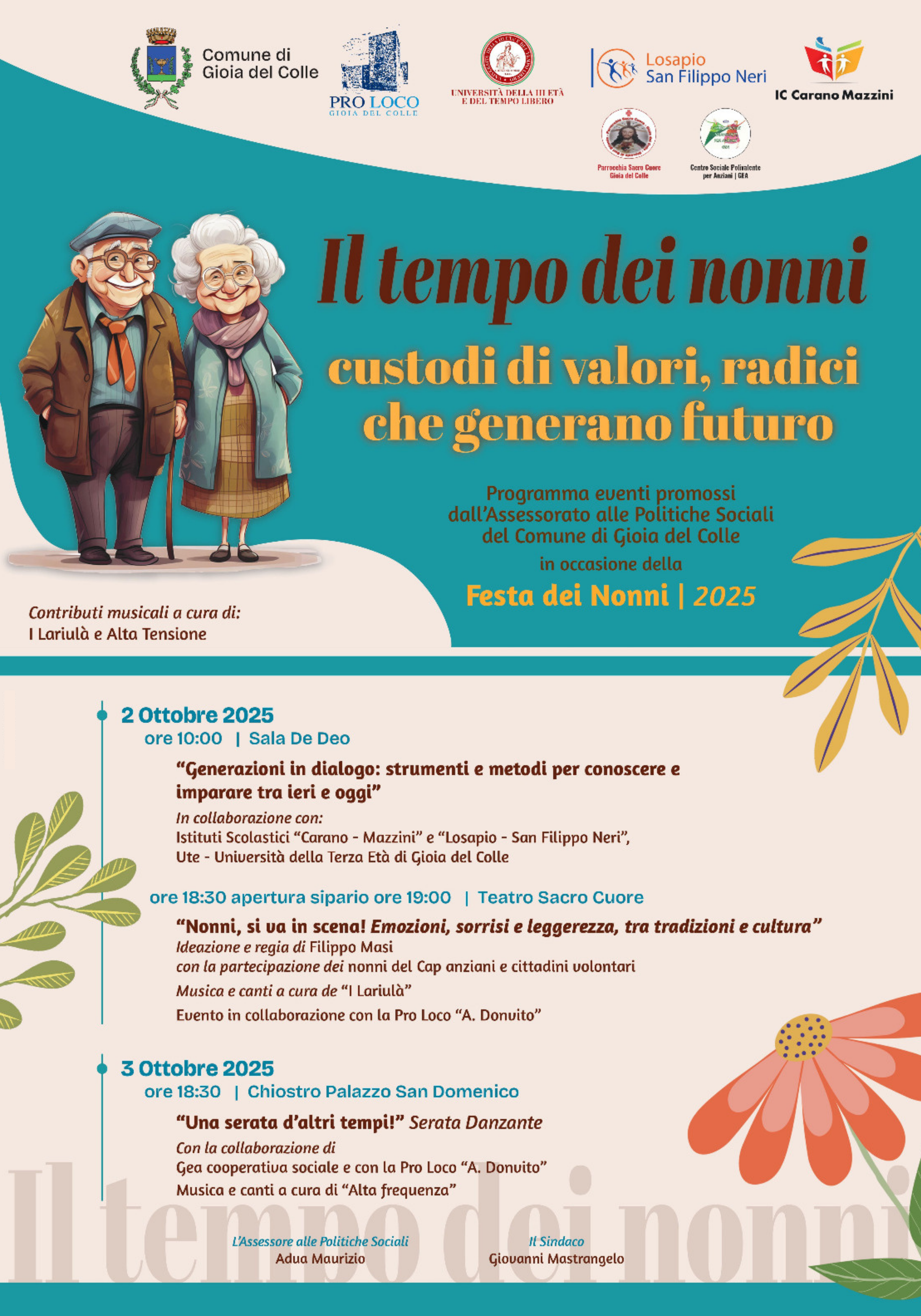 In sinergia con la Pro Loco “Antonio Donvito”, l’Università della Terza Età e del Tempo Libero, il Centro Aperto Polivalente per Anziani gestito dalla Cooperativa Sociale Gea e le scuole secondarie di primo grado “E. Carano” e “F.P. Losapio”, l’assessorato alle Politiche Sociali promuove il programma di eventi “Il tempo dei nonni: custodi di valori, radici che generano futuro” che, nelle giornate del 2 e 3 ottobre, celebrerà in città l’importante ruolo svolto dai nonni nelle famiglie e nella società.
