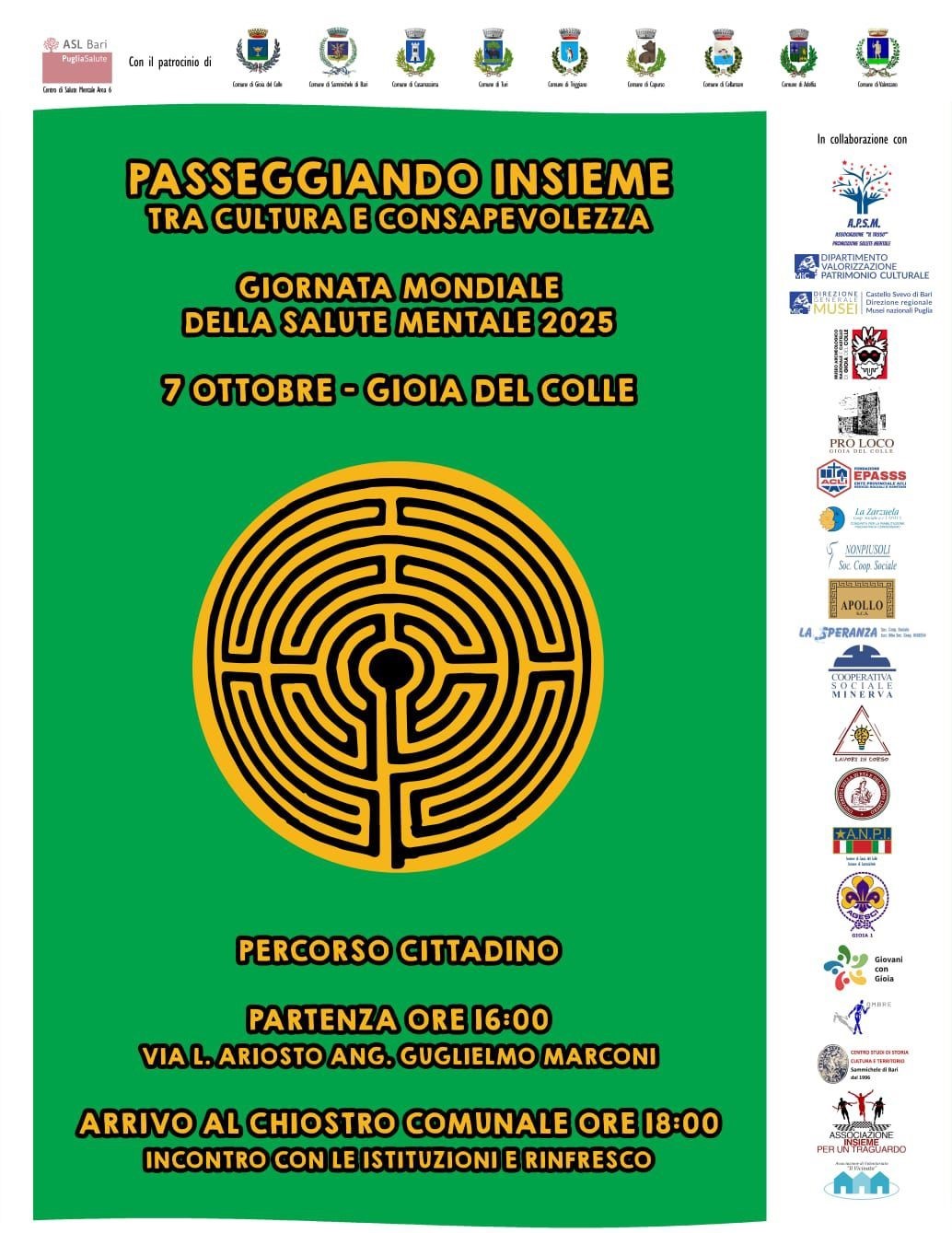 Gioia del Colle si appresta a celebrare la Giornata mondiale della Salute Mentale 2025 con una passeggiata culturale per le vie della città, promossa dai Centri di Salute Mentale dell’Unità Operativa Complessa Area 6 Asl Bari in collaborazione con enti e associazioni del territorio.