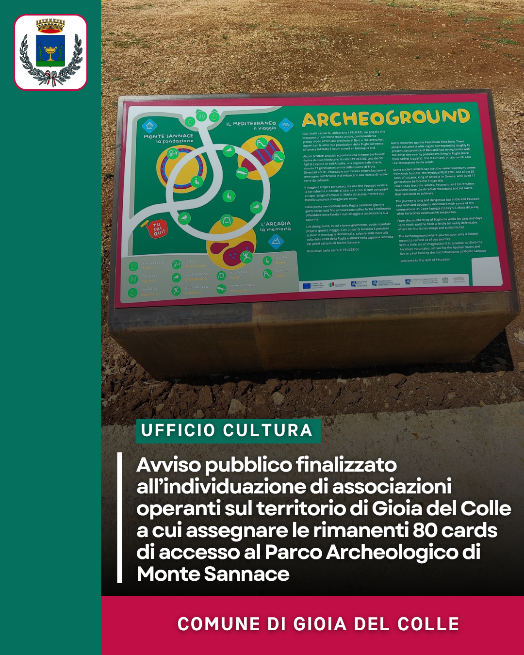 Con determinazione del Responsabile dell’Area Affari Generali n. 1384/2025 è stato approvato l’avviso pubblico finalizzato all’individuazione di associazioni, operanti sul territorio di Gioia del Colle, a cui assegnare le rimanenti 80 cards di accesso (validità 6 mesi) al Parco Archeologico di Monte Sannace, acquistate dal Comune di Gioia del Colle con il duplice obiettivo di promuovere la conoscenza del predetto sito e favorire processi di inclusione e integrazione sociale.