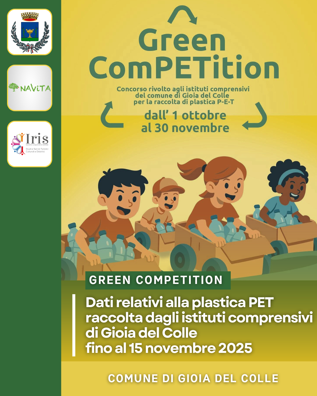 Nell'ambito del progetto, promosso dal Comune di Gioia del Colle in collaborazione con la Navita srl e la società cooperativa sociale Iris, sono stati raccolti finora 19,19 q di plastica PET.