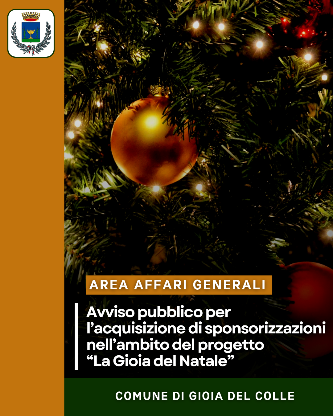 Con determinazione n. 1395/2025 del Responsabile dell’Area Affari Generali è stato approvato un avviso pubblico finalizzato all’acquisizione di sponsorizzazioni a supporto della realizzazione del progetto “La Gioia del Natale”.