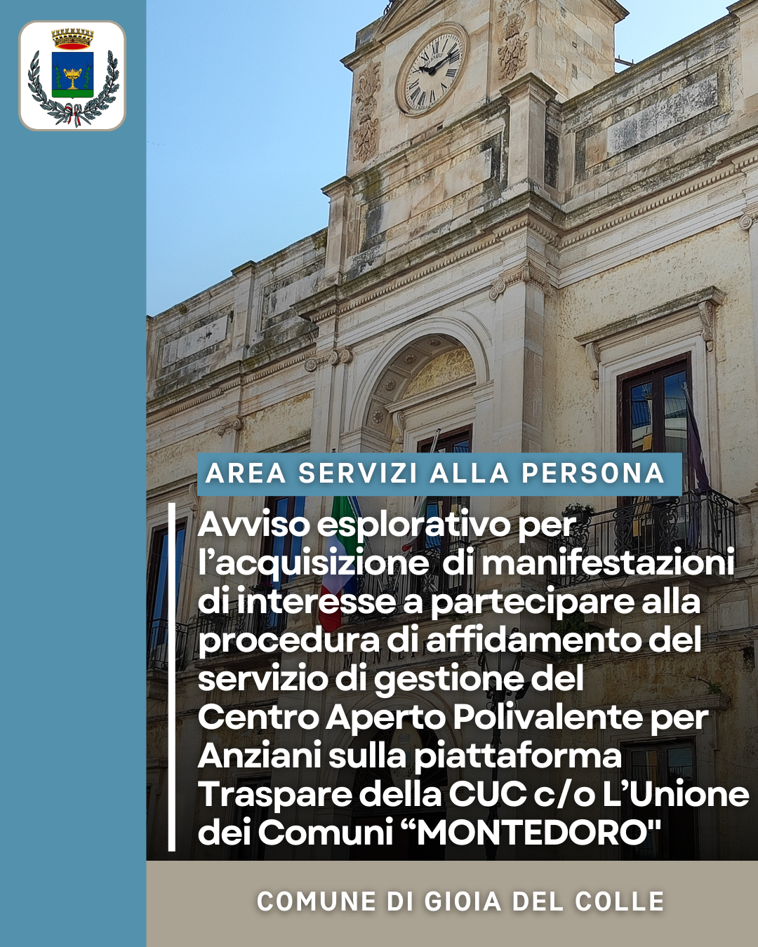 Con determinazione della Responsabile dell’Area Servizi alla Persona n. 1466/2025 è stato approvato un avviso esplorativo finalizzato all’acquisizione di manifestazioni di interesse a partecipare alla procedura di affidamento del servizio di gestione del Centro Aperto Polivalente per Anziani sulla piattaforma Traspare della Centrale Unica di Committenza c/o L’Unione dei Comuni “MONTEDORO".