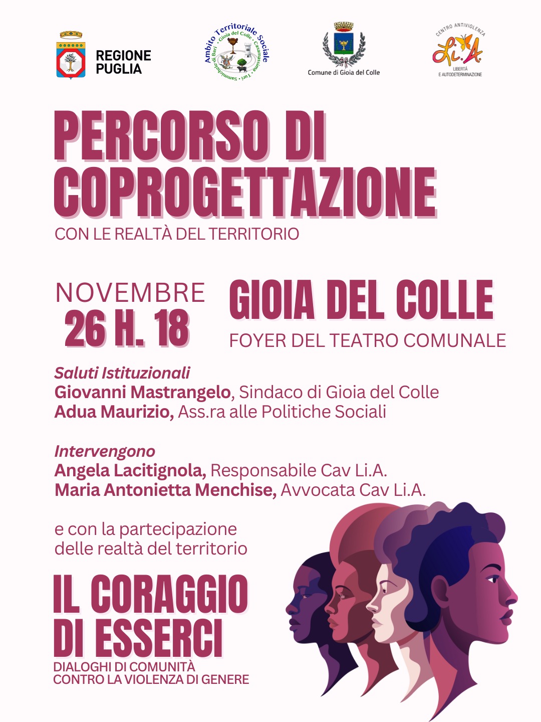 L’incontro, organizzato dall’Ambito Territoriale Sociale di Gioia del Colle in collaborazione con il Centro Antiviolenza Li.A., segnerà l’avvio di un percorso di coprogettazione che coinvolgerà realtà associative, cittadine e cittadini nella realizzazione di azioni e interventi finalizzati alla prevenzione e al contrasto del fenomeno della violenza di genere.