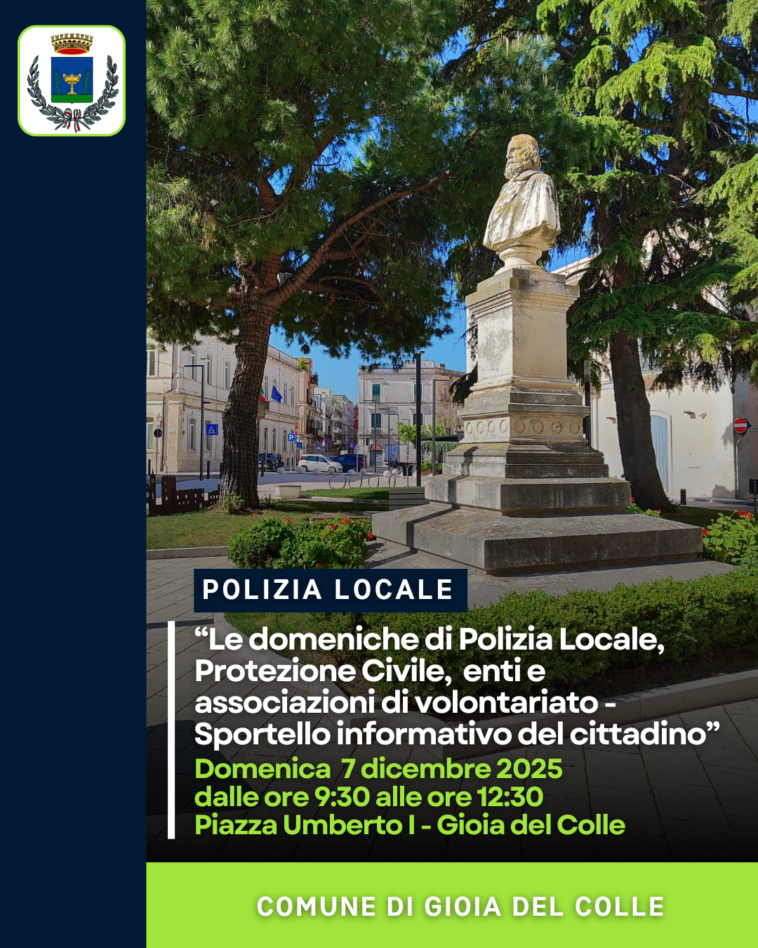 Domenica 7 dicembre 2025, dalle ore 9:30 alle ore 12:30, in piazza Umberto I si svolgeranno attività di sensibilizzazione alla sicurezza stradale.
