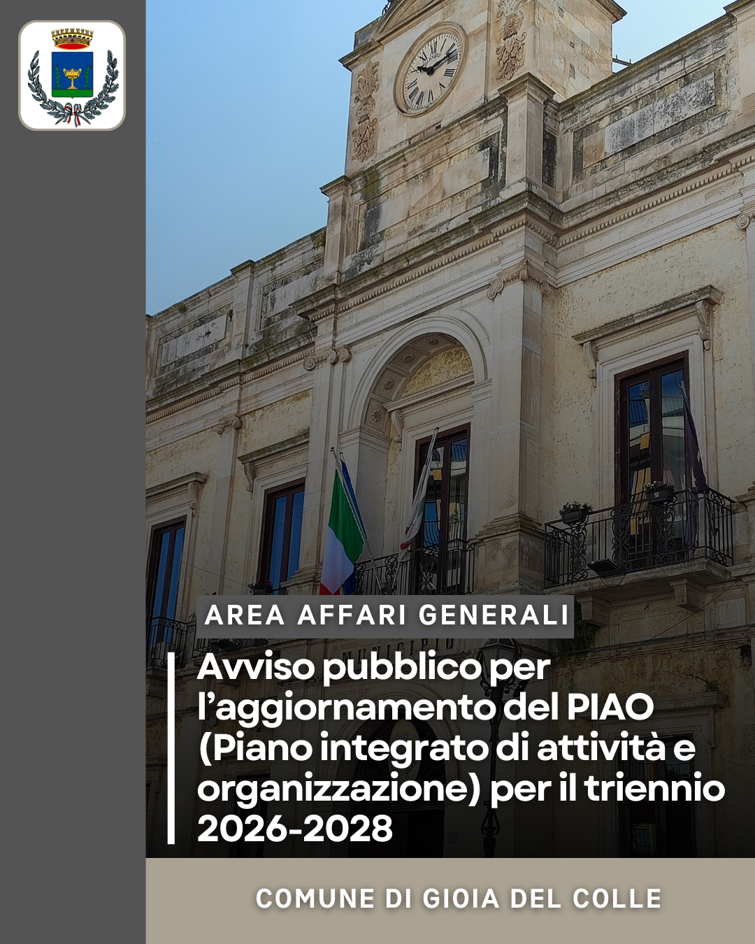 Il Vice Segretario Generale, responsabile per la prevenzione della corruzione e per la trasparenza, invita i cittadini e le organizzazioni portatrici di interessi collettivi a presentare eventuali suggerimenti e/o osservazioni (partendo dal PIAO 2025/27 pubblicato sul sito https://dgegovpa.it/Gioiadelcolle/AmministrazioneTrasparente/DisposizioniGenerali/AttiGenerali?dettaglio=646) mediante la consegna, entro le ore 12:30 di venerdì 30 gennaio 2026, dell'apposito modulo debitamente compilato: