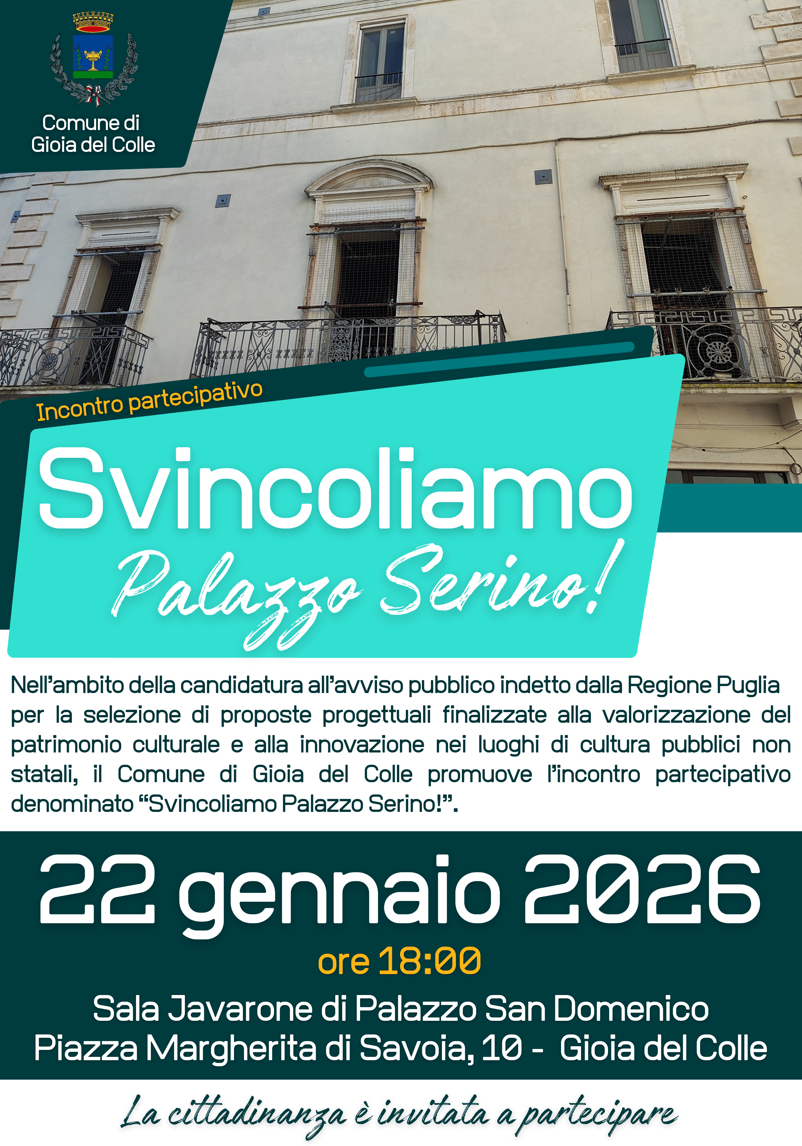 Nell’ambito della candidatura all’avviso pubblico indetto dalla Regione Puglia per la selezione di proposte progettuali finalizzate alla valorizzazione del patrimonio culturale e alla innovazione nei luoghi di cultura pubblici non statali, il Comune di Gioia del Colle promuove l’incontro partecipativo denominato “Svincoliamo Palazzo Serino!”, che si terrà giovedì 22 gennaio 2026, ore 18:00, nella sala Javarone di Palazzo San Domenico.