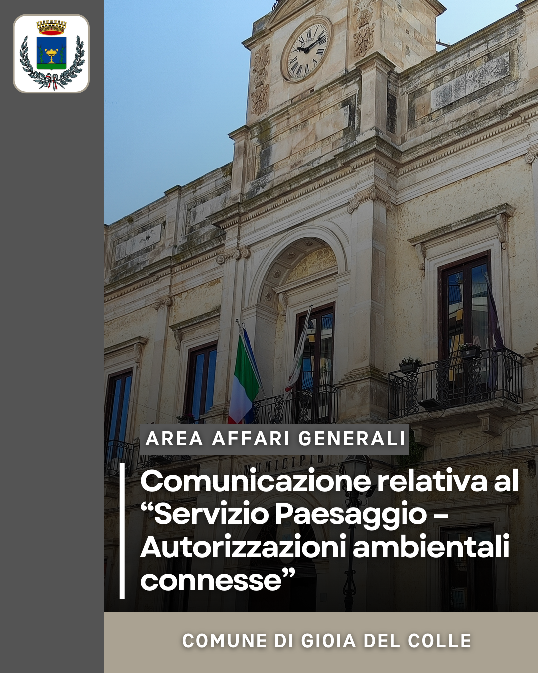 Facendo seguito alla deliberazione della Giunta comunale n. 366/2025 con cui si è proceduto ad approvare un riassetto organizzativo dell’Ente relativo alla macrostruttura delle Aree e dei Servizi e con cui è stata prevista l’assegnazione del “Servizio Paesaggio – Autorizzazioni ambientali connesse” all’Area Affari Generali, si rende noto che tutte le comunicazioni relative al suddetto servizio dovranno essere inviate al seguente indirizzo pec: paesaggio.comune.gioiadelcolle@pec.rupar.puglia.it