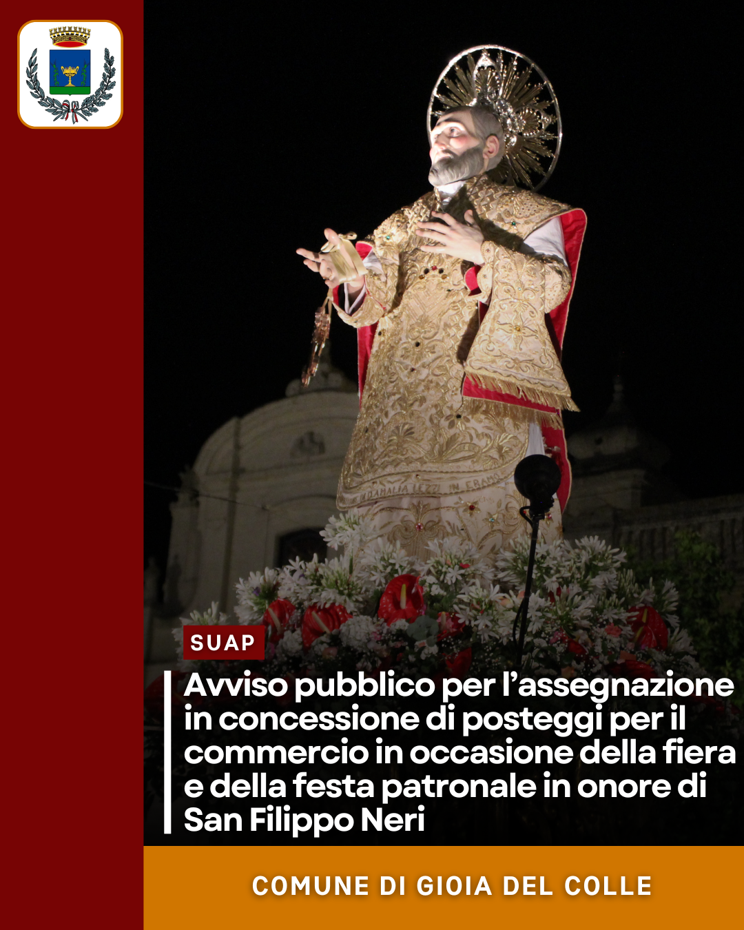 E’ indetta la procedura per l’assegnazione delle concessioni di posteggio per il commercio su aree pubbliche in occasione della Fiera in onore del Santo Patrono “San Filippo Neri”,