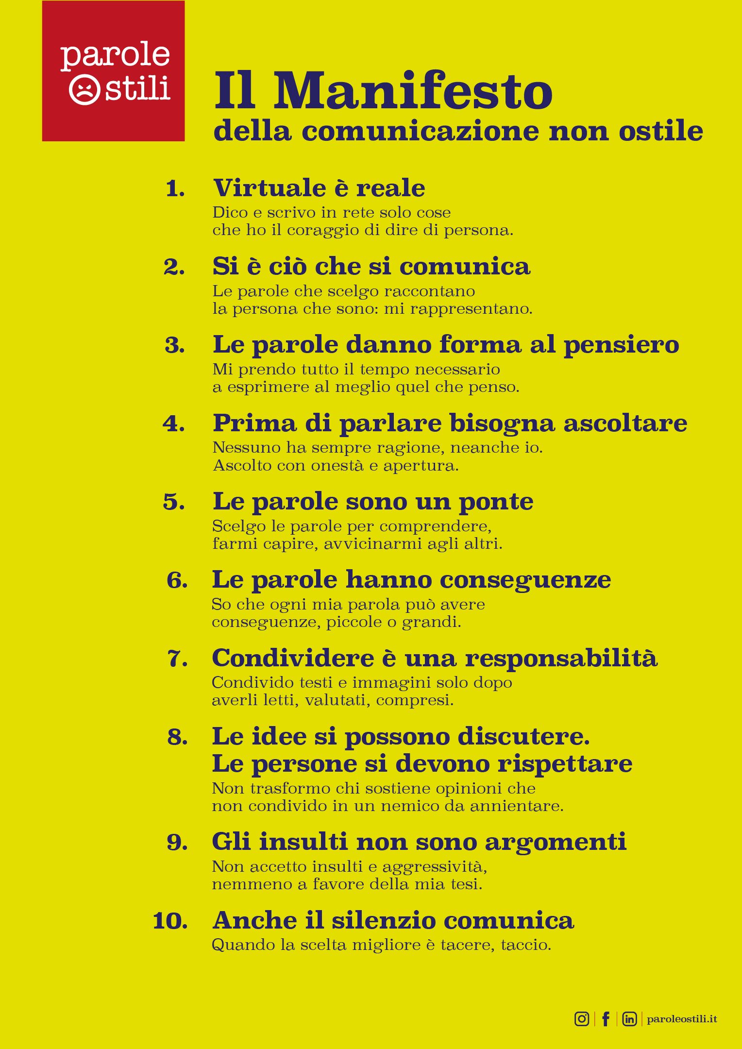 Dalla volontà della predetta associazione di diffondere l’attitudine positiva a scegliere con cura le parole è nato il "Manifesto della comunicazione non ostile", una carta di dieci principi di stile volti a favorire comportamenti civili e rispettosi in rete e in qualsiasi altro contesto sociale.