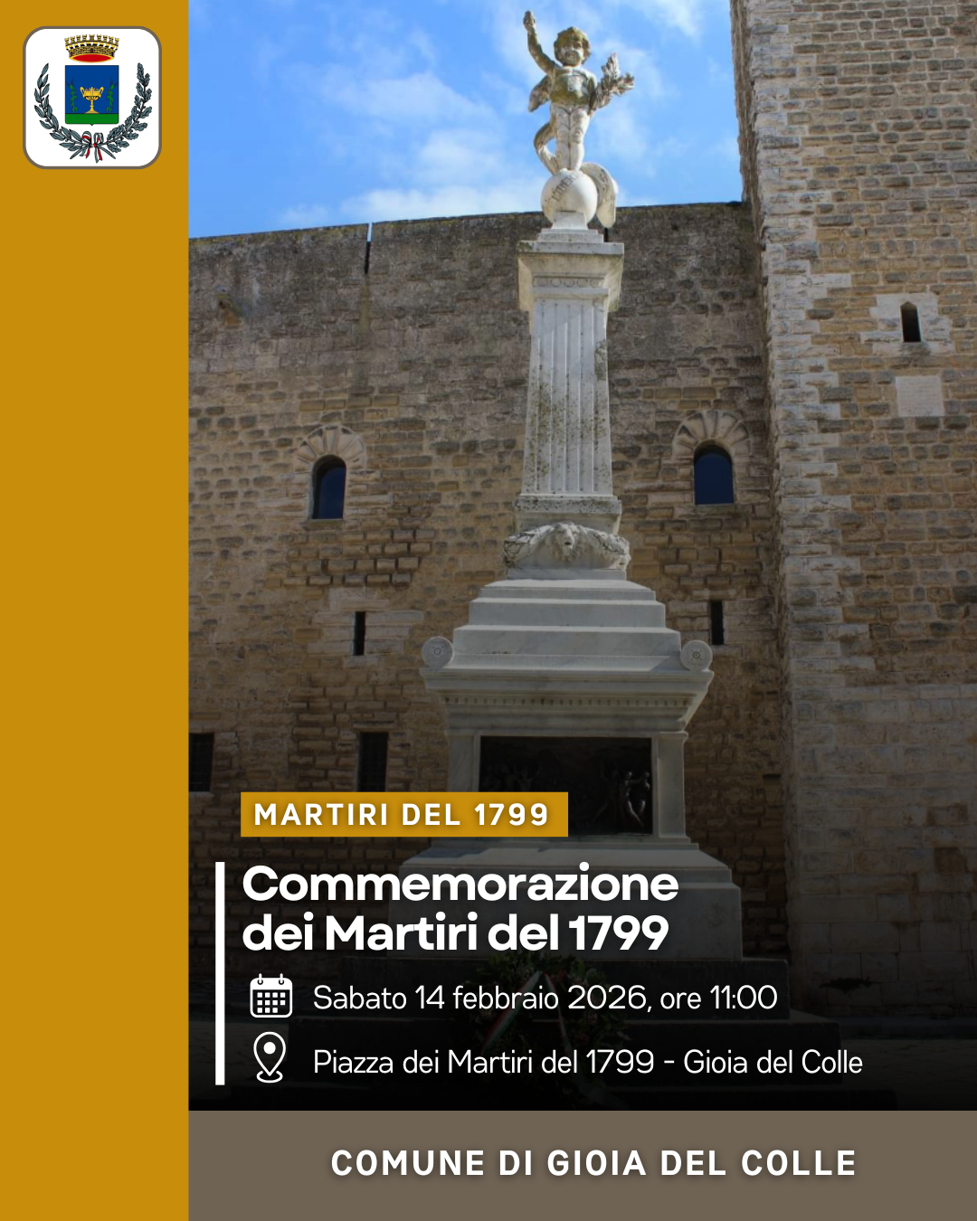 Nel corso della manifestazione, che coinvolgerà docenti, studentesse e studenti delle scuole secondarie di secondo grado di Gioia del Colle, si renderà omaggio alla memoria dei Martiri del 1799 con la deposizione di una corona di alloro e con il contributo storico del prof. Franco Giannini.