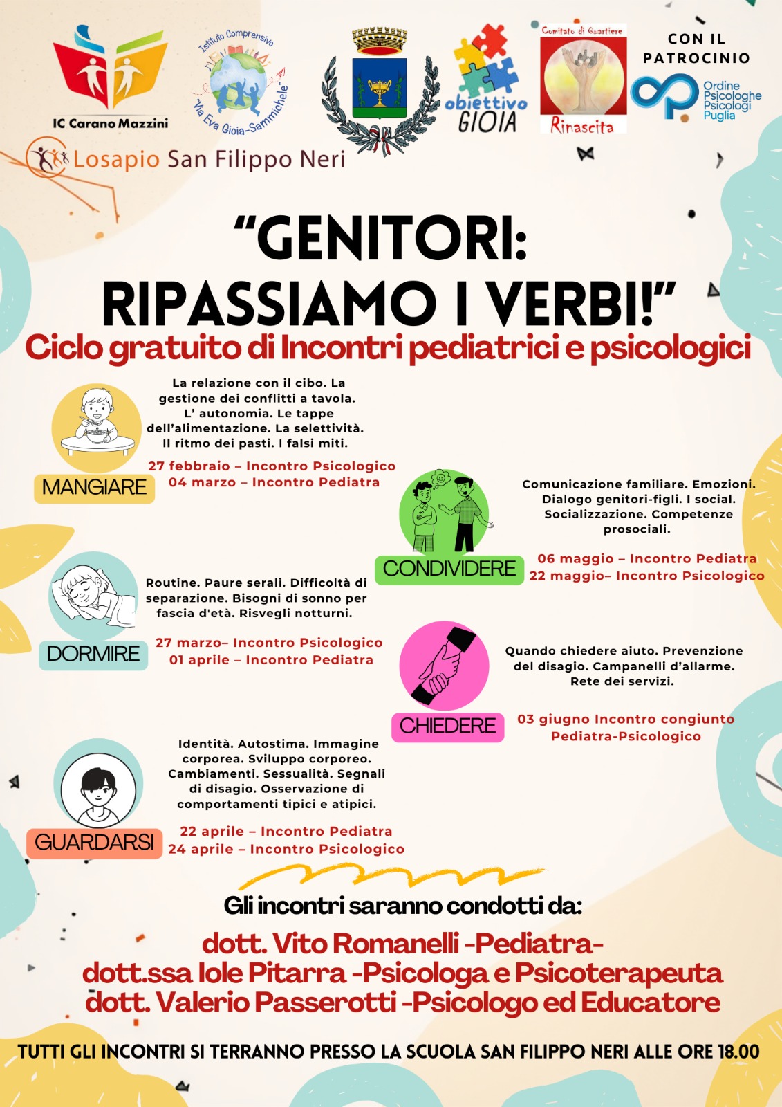 Patrocinato dal Comune di Gioia del Colle e promosso dall'APS "Obiettivo Gioia" in collaborazione con il Comitato di Quartiere Rinascita, il progetto prevede la realizzazione di un percorso di orientamento in ambito pediatrico e psicologico che, fino al 3 giugno 2026, coinvolgerà i genitori di alunne e alunni, frequentanti i tre istituti comprensivi di Gioia del Colle, in nove appuntamenti organizzati presso la scuola primaria "San Filippo Neri".