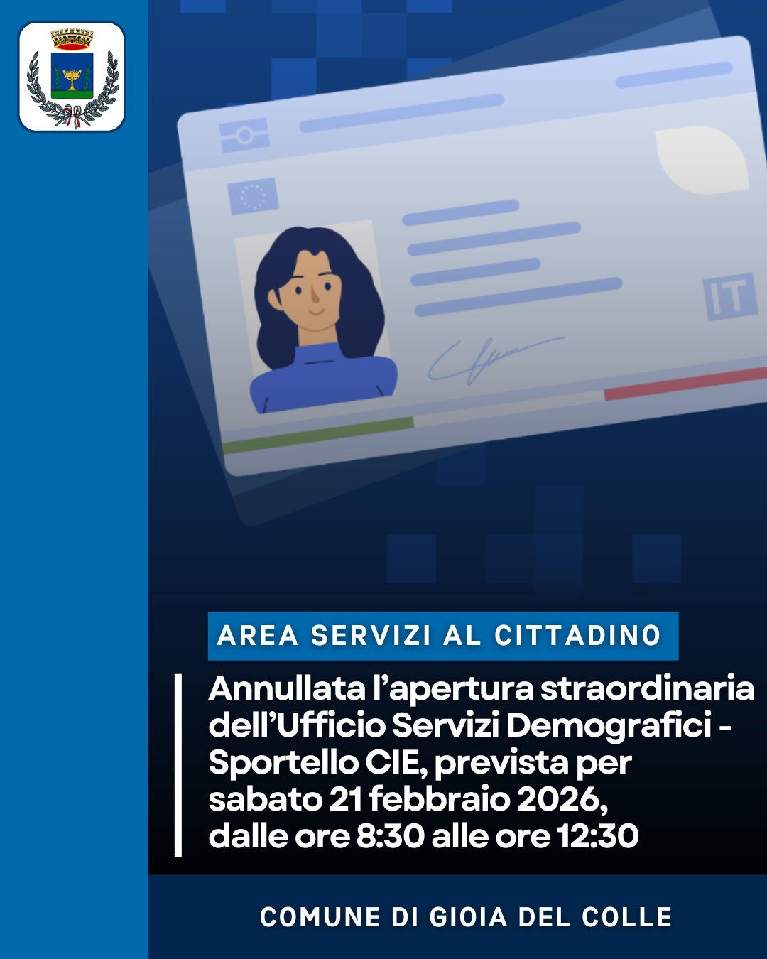 Annullata l'apertura straordinaria dell'Ufficio Servizi Demografici - Sportello CIE, prevista per sabato 21 febbraio 2026, dalle ore 8:30 alle ore 12:30