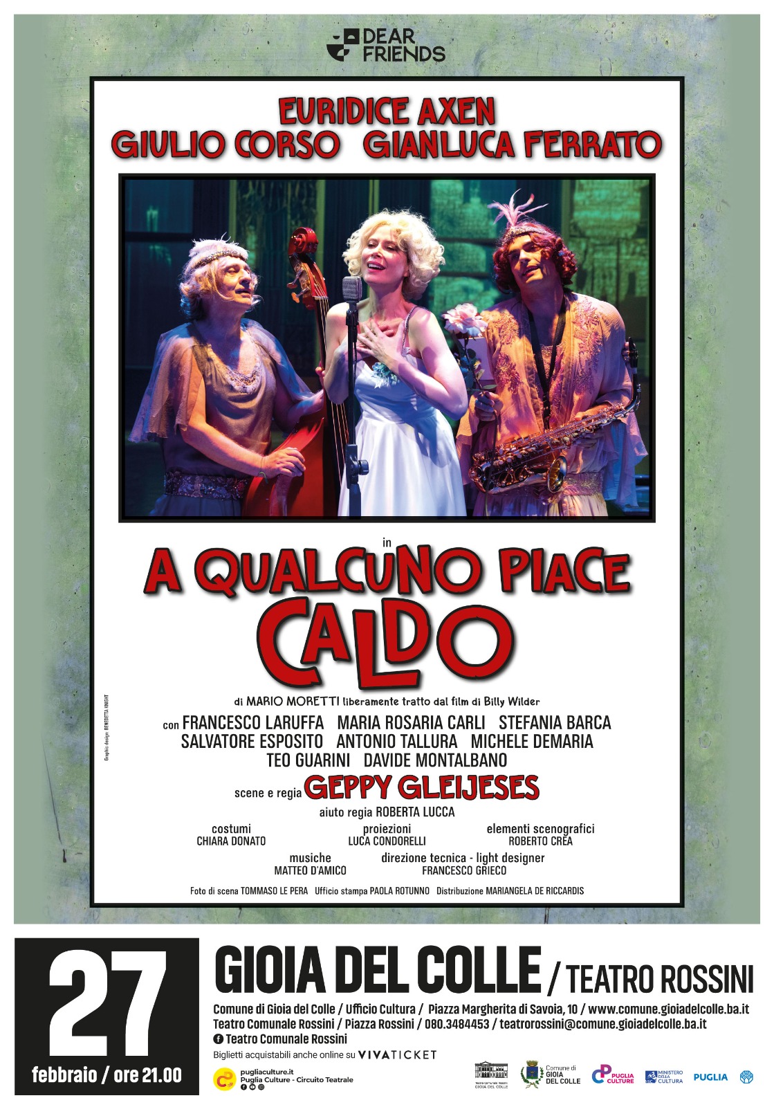 Diretto dal regista Geppy Gleijeses e liberamente tratto da uno dei capolavori della storia del cinema, “Some like it hot” di Billy Wilder, lo spettacolo sarà portato in scena da Roberta Lucca (che sostituirà Euridice Axen), Giulio Corso, Gianluca Ferrato e un cast d’eccezione nella serata di venerdì 27 febbraio (apertura sipario: ore 21:00).