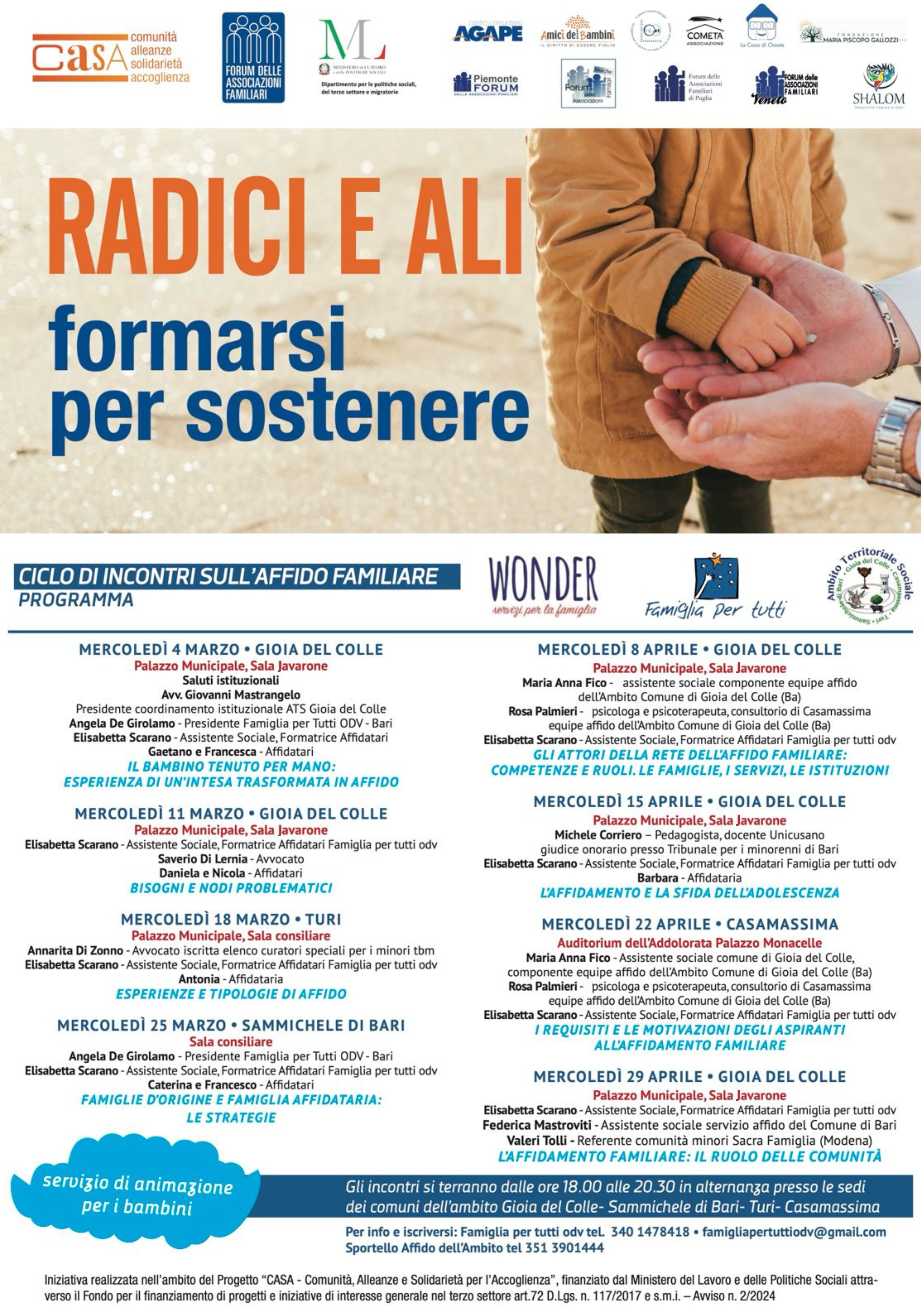 Promossa dalla rete del Forum delle Associazioni Familiari di Puglia e realizzata da Famiglia per Tutti ODV in collaborazione con l’Ambito Territoriale Sociale di Gioia del Colle, l’équipe Affido di Ambito e il Centro Servizi per le Famiglie “Wonder“, l’iniziativa coinvolgerà le cittadine e i cittadini dei comuni di Gioia del Colle, Casamassima, Sammichele di Bari e Turi in otto appuntamenti di informazione e sensibilizzazione sul tema, che saranno impreziositi dal racconto delle esperienze vissute dagli affidatari.