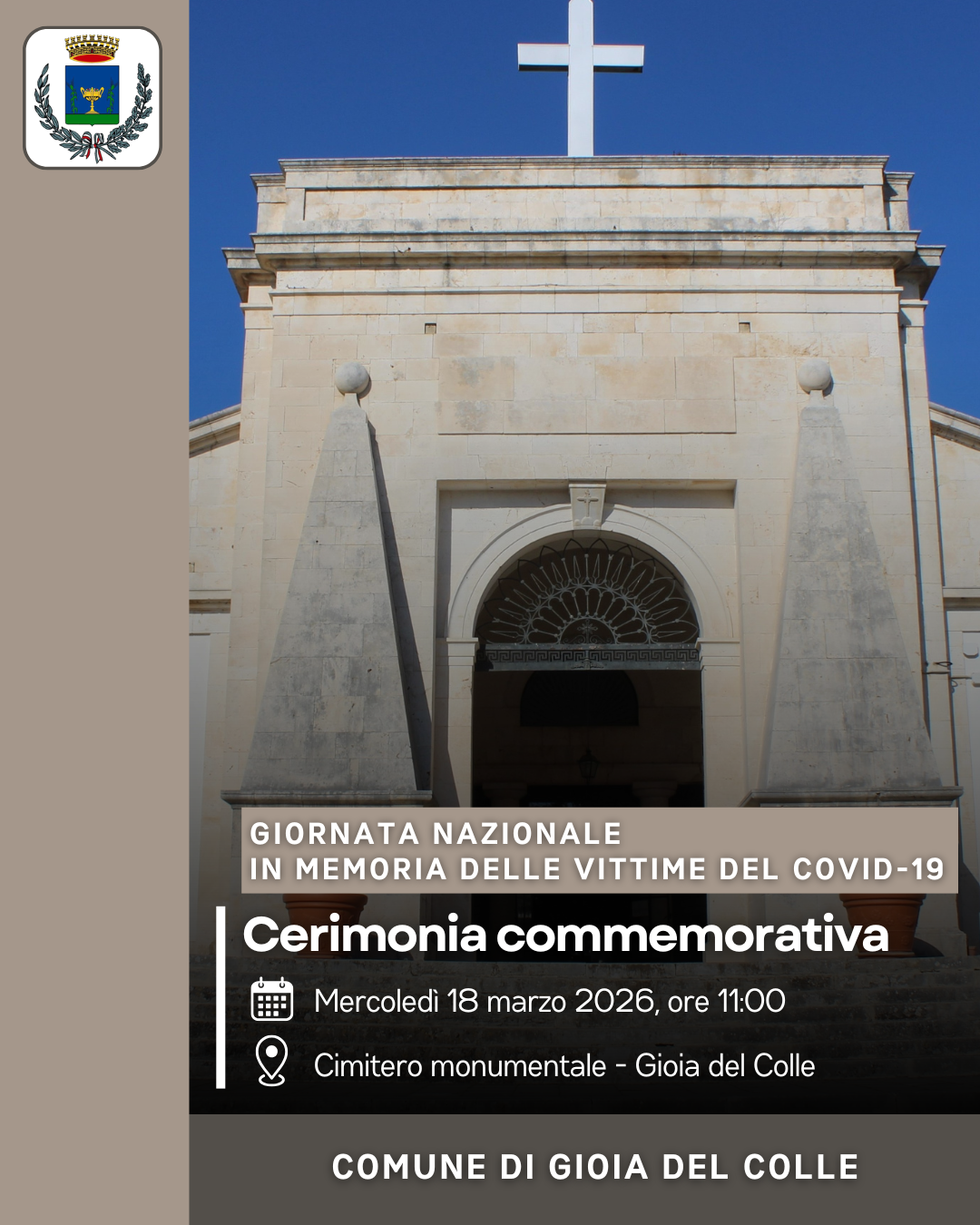 In occasione della Giornata nazionale in memoria delle vittime del Covid-19, mercoledì 18 marzo 2026, alle ore 11:00, si terrà una cerimonia commemorativa al Cimitero monumentale di Gioia del Colle.
