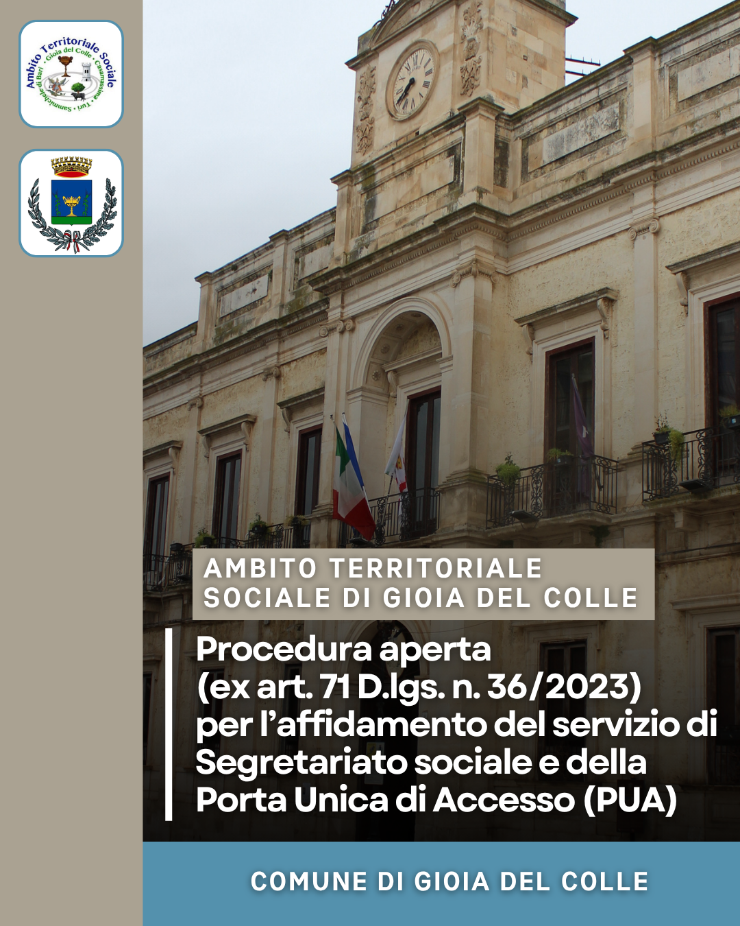 In esecuzione della determinazione della Responsabile del Settore n. 349 del 27 marzo 2026, l’Ambito Territoriale Sociale (ATS) di Gioia del Colle, che comprende i comuni di Gioia del Colle (capofila), Casamassima, Sammichele di Bari e Turi, ha indetto una gara, mediante procedura aperta, per l’affidamento del “Servizio di Segretariato Sociale e PUA-UVM”.