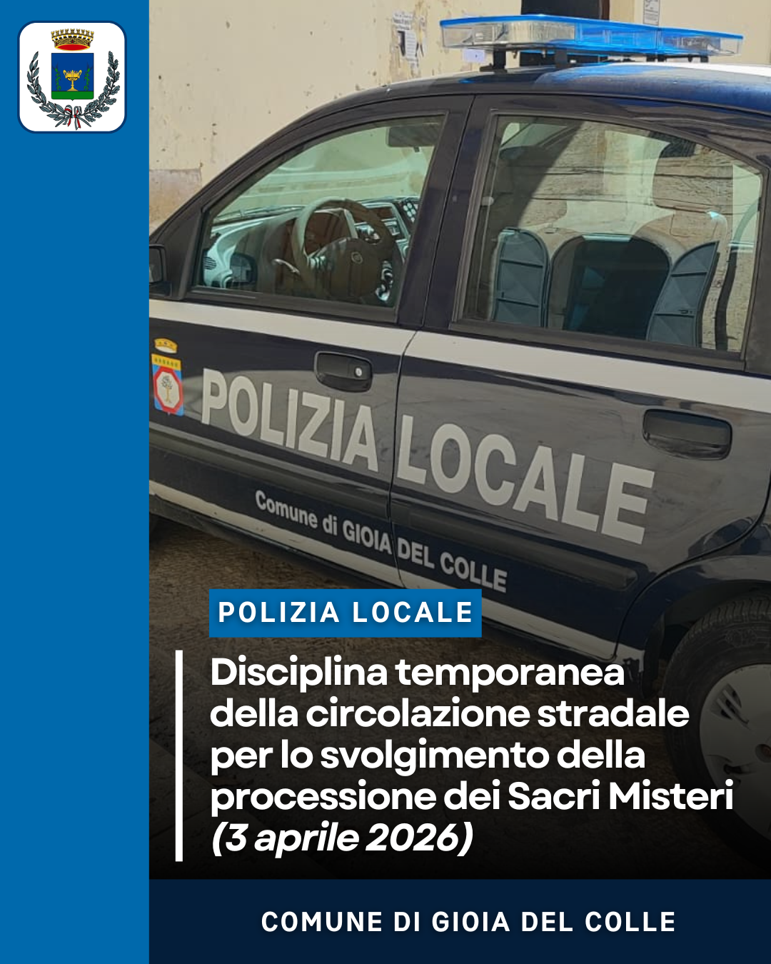 Si informa la cittadinanza che, in vista della processione dei Sacri Misteri (in programma venerdì 3 aprile 2026), il comandante della Polizia Locale ha emesso l'ordinanza n. 43/2026 per la disciplina temporanea della circolazione stradale nelle vie interessate.