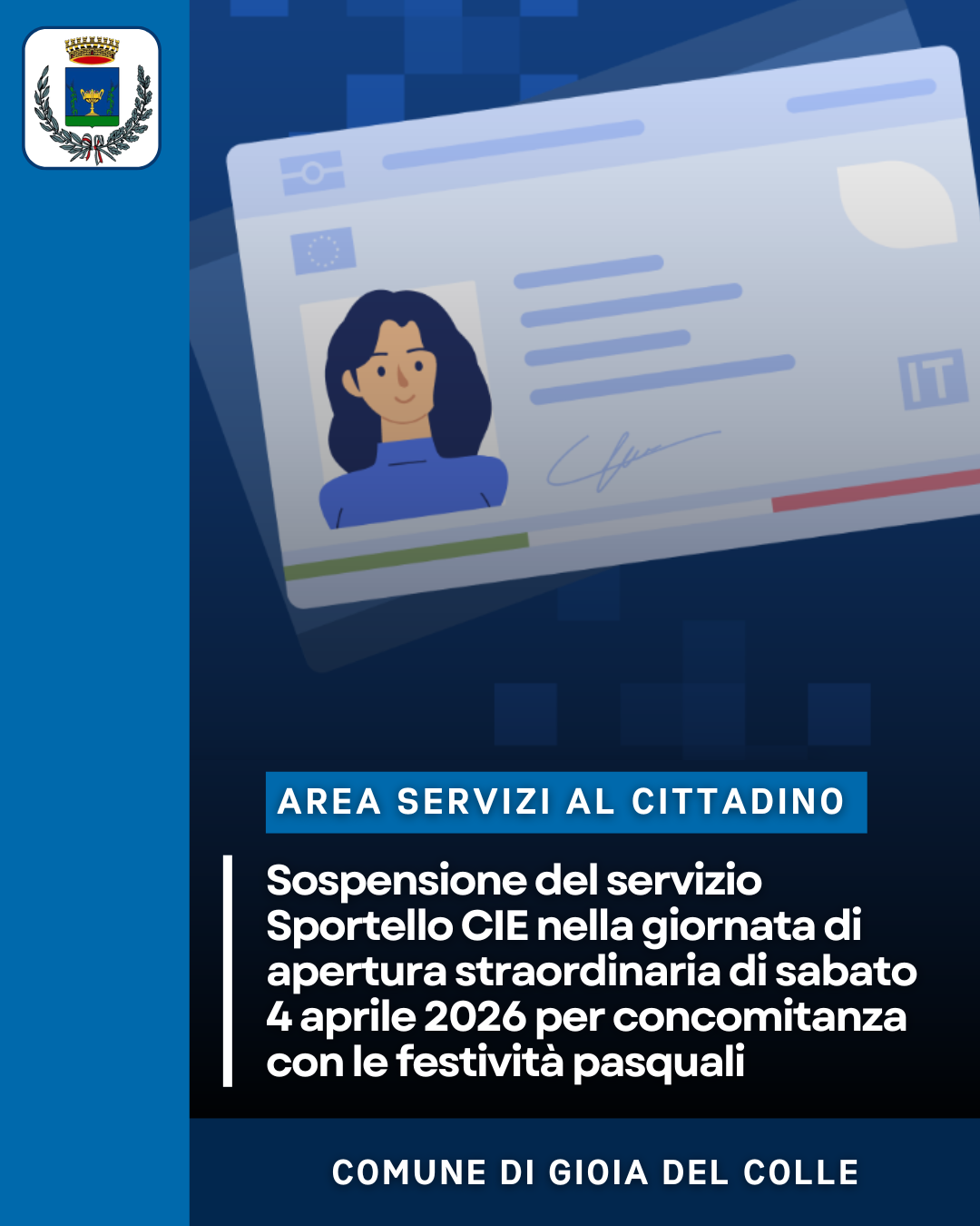 Sospensione del servizio Sportello CIE nella giornata di apertura di sabato 4 aprile 2026 per concomitanza con le festivitą pasquali