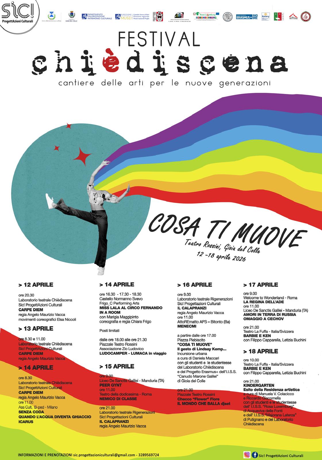 “Quest’anno il Festival Chièdiscena raggiunge l’importante traguardo della nona edizione – afferma lo staff dell’associazione Sic! ProgettAzioni Culturali -. Il cantiere delle arti dello spettacolo dedicato alle giovani generazioni ospiterà spettacoli in matinée realizzati da scuole superiori e associazioni culturali provenienti da tutta Italia, spettacoli serali con compagnie professioniste, incursioni urbane, residenze artistiche, percorsi di visione critica, occasioni di incontro e approfondimento con operatori del settore. Attraverso un lavoro sinergico con le istituzioni del territorio, puntiamo ad allenare i giovani in età compresa tra 14 e 25 anni a riconoscere e a praticare i valori educativi e culturali del teatro, contribuendo così alla formazione di cittadine e cittadini consapevoli. Il nostro obiettivo è quello di stimolare la riflessione e il dibattito, favorire l’incontro tra giovani provenienti da diverse realtà e sensibilizzare l’opinione pubblica sul rapporto fondamentale tra teatro e scuola. Vi aspettiamo al Festival. Non mancate”.