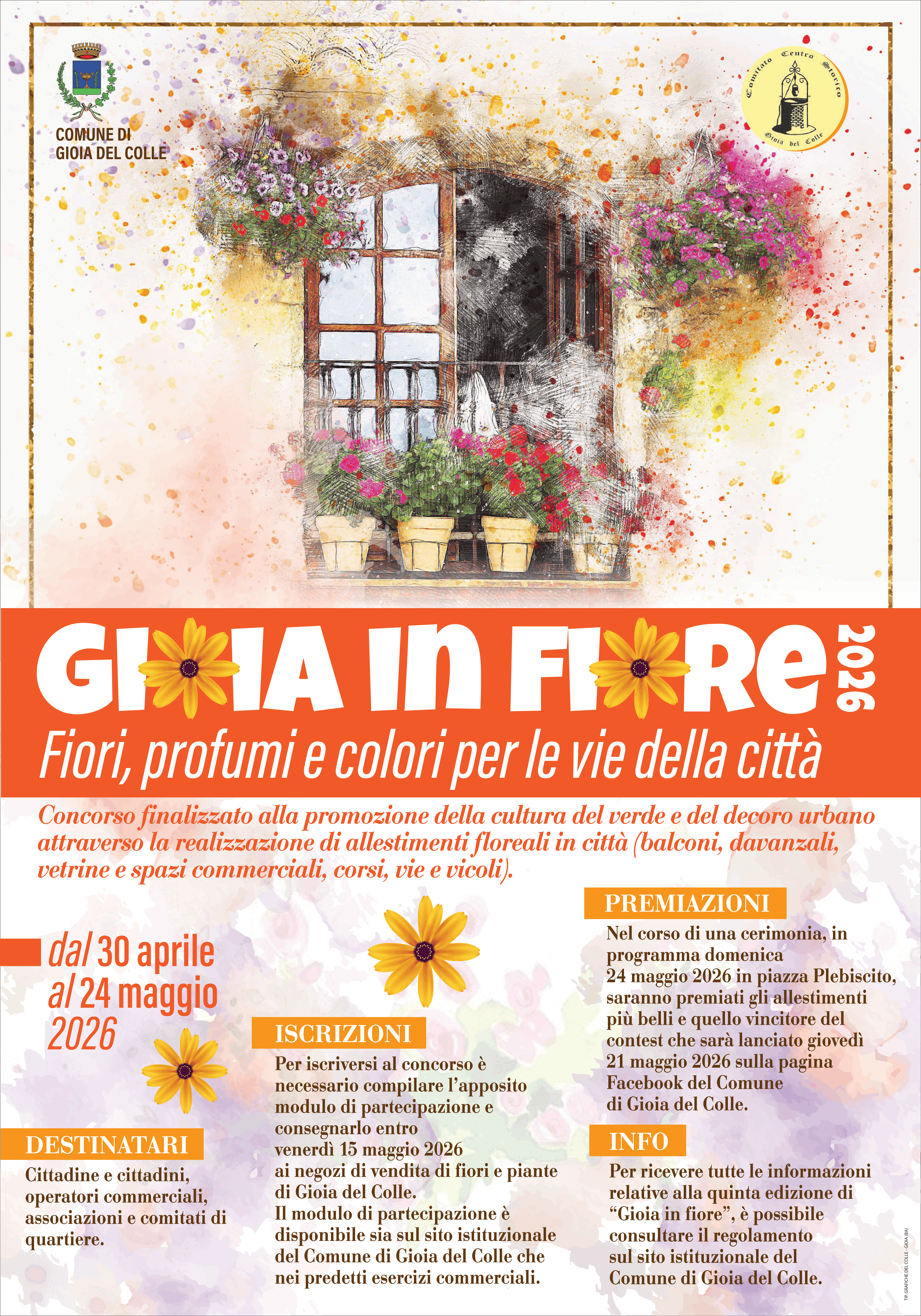 Nell’ambito dell’iniziativa, promossa in collaborazione con il Comitato Centro Storico di Gioia del Colle, cittadine e cittadini, operatori commerciali, associazioni e comitati di quartiere avranno la possibilità di cimentarsi nella realizzazione e nella cura di allestimenti floreali (su balconi e davanzali; in vetrine e spazi commerciali; in corsi, vie e vicoli) nel periodo che va dal 30 aprile al 24 maggio 2026.