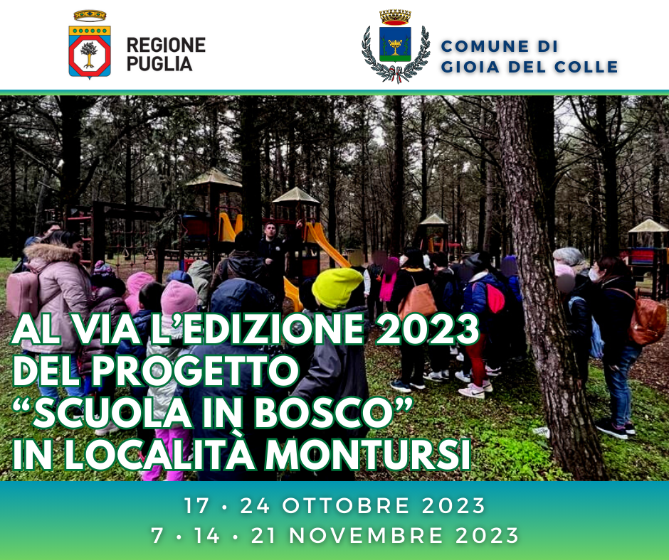 Partiranno domani, martedì 17 ottobre 2023, le numerose attività legate al progetto "Scuola in bosco", fortemente voluto e riproposto dall'amministrazione Mastrangelo che, anche quest'anno, è risultata vincitrice di un finanziamento regionale destinato a gestori di boschi didattici.