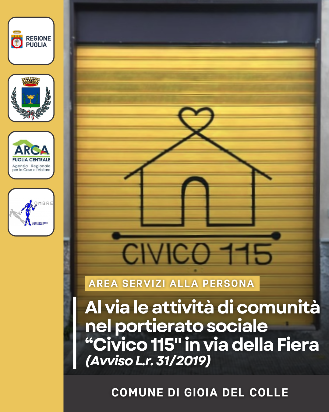 Partono oggi, giovedì 23 ottobre 2025, le iniziative del progetto CIVICO115 – I Trav. via della Fiera, promosso dal Comune di Gioia del Colle - Area Servizi alla Persona e in collaborazione con l'ente partner Arca Puglia Centrale. Il progetto si è classificato primo nella graduatoria regionale, in risposta all'Avviso Pubblico della Regione Puglia Sezione Politiche Abitative - Dipartimento Ambiente, Paesaggio e Qualità Urbana e in attuazione della L.R. 31/2019 - denominato "Condominio Solidale" - che rilancia con forza un’idea diversa: abitare può diventare un atto collettivo, un gesto di cura reciproca.