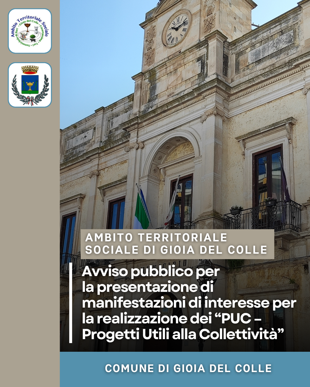 Con questo Avviso Pubblico, l'Ambito Territoriale Sociale di Gioia del Colle, Casamassima, Turi e Sammichele di Bari intende promuovere i progetti utili alla collettività in ambito culturale, sociale, artistico, ambientale, formativo e di tutela dei beni comuni, non solo come opportunità di inserimento nel contesto socio - lavorativo dei beneficiari, in virtù delle loro competenze professionali, ma anche come occasione di crescita e qualificazione delle comunità locali di riferimento.