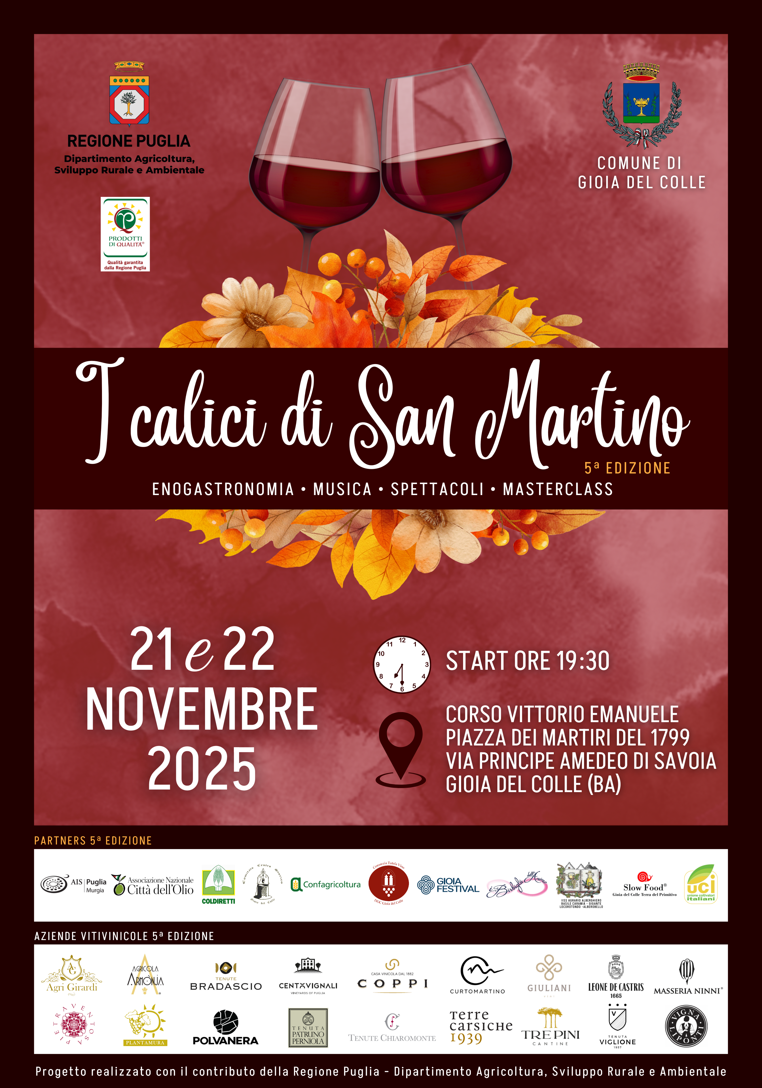 La quinta edizione de “I Calici di San Martino” è promossa dal Comune di Gioia del Colle con il contributo della Regione Puglia – Dipartimento Agricoltura, Sviluppo Rurale e Ambientale e la collaborazione dei partners Ais Puglia – Delegazione Murgia, l'associazione nazionale Città dell'Olio, Coldiretti, Comitato Centro Storico di Gioia del Colle, Confagricoltura, Consorzio di Tutela Vini DOP di Gioia del Colle, Gioia Festival, I Bisbiglii dell’Anima, IISS Agrario Alberghiero “Basile Caramia-Gigante” di Locorotondo – Alberobello, Slow Food e Uci.